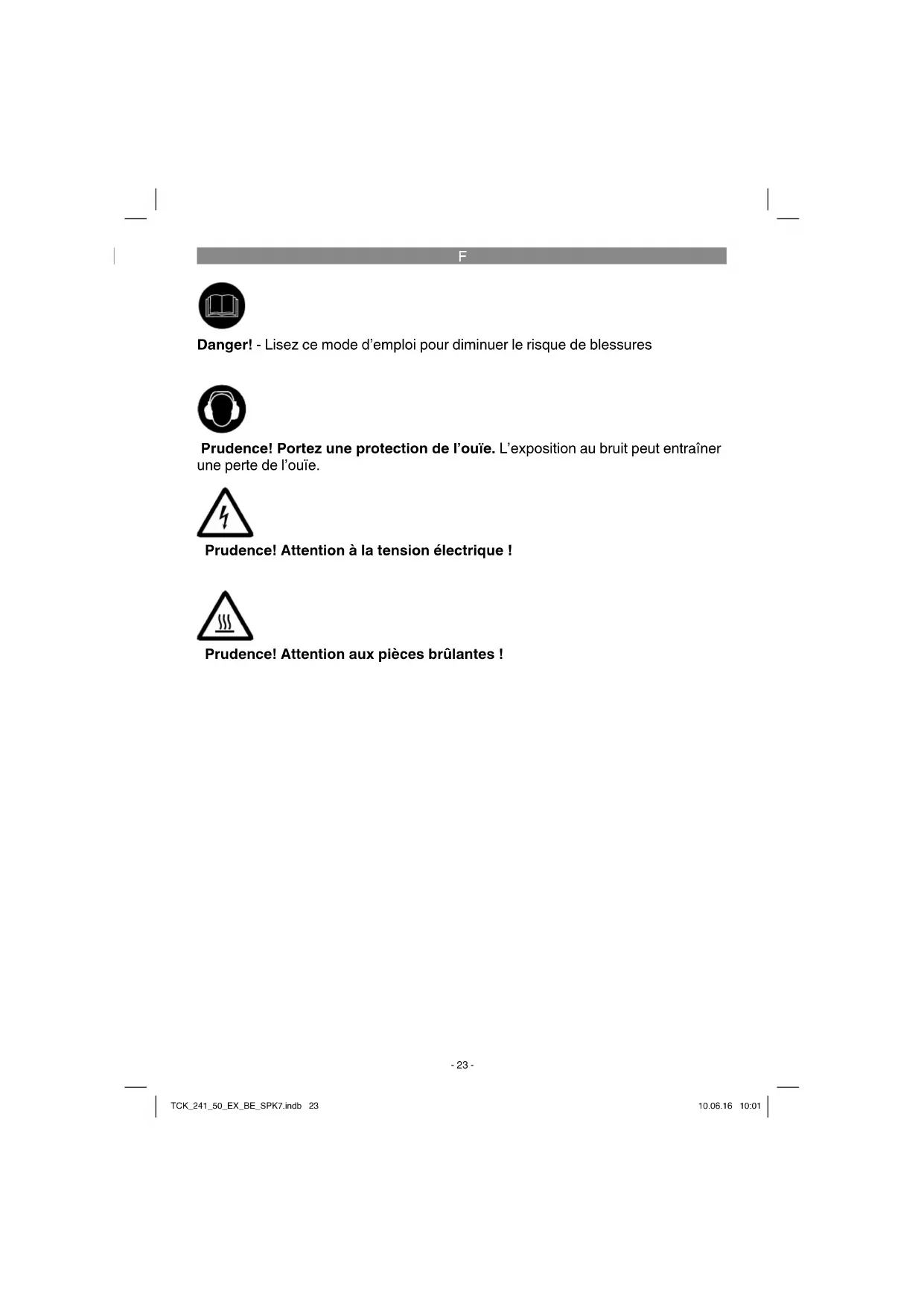Danger! - Lisez ce mode d’emploi pour diminuer le risque de blessures Prudence! Portez une protection de l’ouïe. L’exposition au bruit peut entraîner une perte de l’ouïe. Prudence! Attention à la tension électrique ! Prudence! Attention aux pièces brûlantes ! TCK_241_50_EX_BE_SPK7.indb 23TCK_241_50_EX_BE_SPK7.indb 23 10.06.16 10:0110.06.16 10:01F