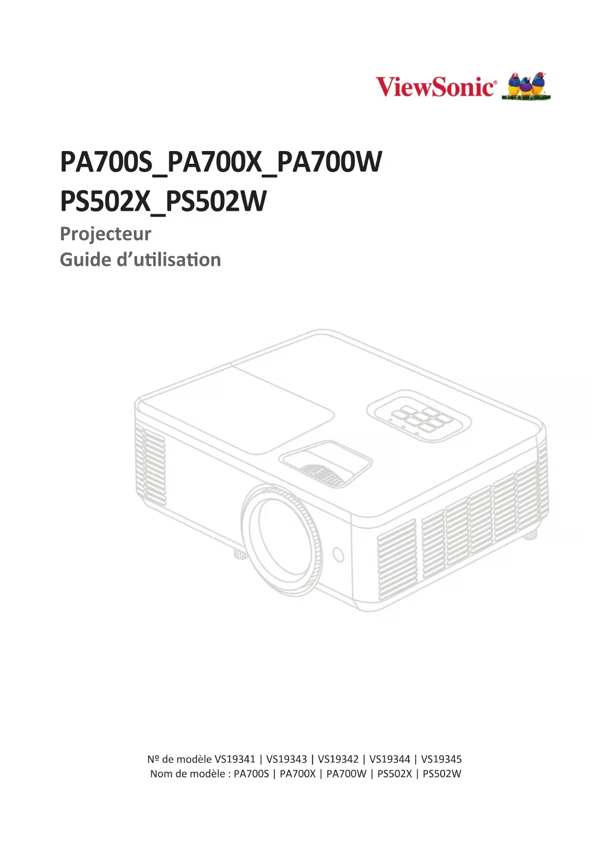 PA700S_PA700X_PA700W PS502X_PS502W Projecteur Guide d’ulisaon Nº de modèle VS19341 | VS19343 | VS19342 | VS19344 | VS19345 Nom de modèle : PA700S | PA700X | PA700W | PS502X | PS502WMerci d’avoir choisi ViewSonic® ViewSonic®, un des principaux fournisseurs mondiaux de soluons visuelles, s’engage à dépasser les aentes du monde en maère d’évoluon technologique, d’innovaon et de simplicité. Chez ViewSonic®, nous pensons que nos produits peuvent avoir un impact posif dans le monde et nous sommes convaincus que le produit ViewSonic® que vous avez choisi vous sera ule. Encore une fois, merci d’avoir choisi ViewSonic® !3 Précautions de sécurité - Général Veuillez lire les Précautions de sécurité suivantes avant de commencer à utiliser le projecteur.