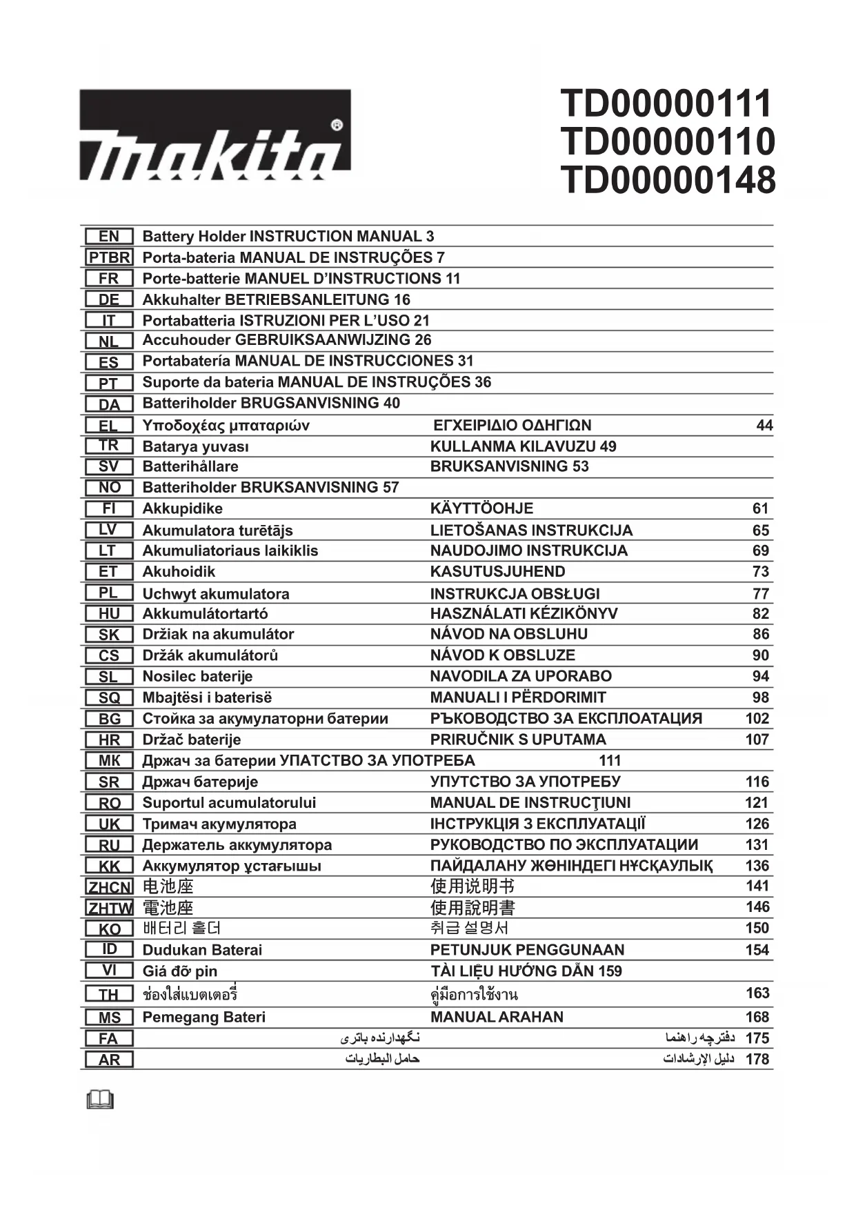 Pour mettre en place la batterie, alignez la languette sur la batterie avec la rainure sur le compartiment et insérez-la. Insérez la batterie à fond jusqu’à ce qu’elle se verrouille en place avec un léger déclic. Si la marque rouge sur le dessus du bouton est visible, cela signie qu’elle n’est pas bien verrouillée. Pour retirer la batterie, faites-la glisser hors du porte-batterie tout en appuyant sur le bouton à l’avant de la batterie. ATTENTION : Insérez toujours la batterie à fond, jusqu’à ce que la marque rouge ne soit plus visible. Autrement, la batterie pourrait tomber accidentellement du porte-batterie, au risque de vous blesser ou de blesser quelqu’un se trouvant près de vous. ATTENTION : Ne forcez pas pour insérer la batterie. Si la batterie ne glisse pas facilement, c’est que vous ne l’insérez pas correctement. Fixation du porte-batterie Vous pouvez accrocher le porte-batterie à votre ceinture. Pour éviter que le porte-batterie tombe accidentelle- ment, attachez une courroie à l’orice pour courroie et serrez-la. ► Fig.3: 1. Orice pour courroie Le porte-batterie est pourvu d’une fonction anti-chute. Lorsque vous retirez le porte-batterie de la ceinture, tirez-le vers le haut tout en appuyant sur le bouton de déverrouillage. ► Fig.4: 1. Bouton de déverrouillage Connexion de dispositifs USB ATTENTION : Connectez uniquement des dispositifs compatibles avec le port USB. Vous risqueriez autrement de provoquer un dysfonctionne- ment du porte-batterie. REMARQUE : Avant de connecter un dispositif USB au porte-batterie (avec la batterie en place), sauvegardez toujours les données du disposi- tif USB. Vous risqueriez autrement de perdre vos données. REMARQUE : Le porte-batterie peut ne pas fournir de courant à certains dispositifs USB. REMARQUE : Lorsque vous ne l’utilisez pas ou après la charge, retirez le câble USB et fermez le couvercle. Le porte-batterie (avec la batterie en place) peut servir de source d’alimentation externe pour des dispositifs USB. Ouvrez le couvercle et branchez un câble USB (non fourni) sur le port USB du porte-batterie. Puis, rac- cordez l’autre extrémité du câble à l’appareil. Pour commencer la charge, maintenez enfoncé le bouton d’alimentation jusqu’à ce que l’indicateur de niveau de la puissance s’allume. Pour arrêter la charge, mainte- nez enfoncé le bouton d’alimentation jusqu’à ce que l’indicateur de niveau de la puissance s’éteigne. ► Fig.5: 1. Couvercle 2. Port USB NOTE : Le courant de sortie réel dépend du dispositif USB à raccorder. NOTE : La batterie se décharge pendant que le bou- ton d’alimentation est placé sur Marche. Placez tou- jours le bouton sur Arrêt lorsque vous ne l’utilisez pas. NOTE : Lorsque vous chargez plusieurs dispositifs USB l’un après l’autre, attendez environ 10 secondes après le chargement complet du dispositif précédent avant de charger le suivant.15 FRANÇAIS ENTRETIEN REMARQUE : N’utilisez jamais d’essence, ben- zine, diluant, alcool ou autre produit similaire. Ces produits présentent un risque de décolora- tion, de déformation ou de ssuration. REMARQUE : Ne lavez pas le porte-batterie avec de l’eau. — Essuyez la saleté, la poussière, l’huile, la graisse, etc., sur le logement avec un chion sec propre ou un chion imbibé d’eau savonneuse et légèrement essoré. — Conservez l’appareil dans un endroit où il ne sera pas extrêmement chaud, froid ou humide. Pour assurer la SÉCURITÉ et la FIABILITÉ du produit, toute réparation, tout travail d’entretien ou de réglage doivent être eectués par un centre d’entretien Makita agréé, avec des pièces de rechange Makita.16 DEUTSCH DEUTSCH (Original-Anleitung) TECHNISCHE DATEN Modell TD00000111 TD00000148 Akkuhalter für LXT-Akku TD00000110 Akkuhalter für CXT-Akku Nennspannung D.C. 14,4 V D.C. 18 V D.C. 10,8 V - 12 V max. Akku BL1415N / BL1430B / BL1440 / BL1460B BL1815N / BL1820B / BL1830 / BL1830B / BL1840B / BL1850B / BL1860B BL1016 / BL1021B / BL1041B USB-Stromversorgungsanschluss D.C. 5 V, 2,4 A, Typ A Abmessungen (L x B x H) 100 mm x 78 mm x 39 mm 88 mm x 61 mm x 33 mm Nettogewicht 0,14 kg 0,09 kg