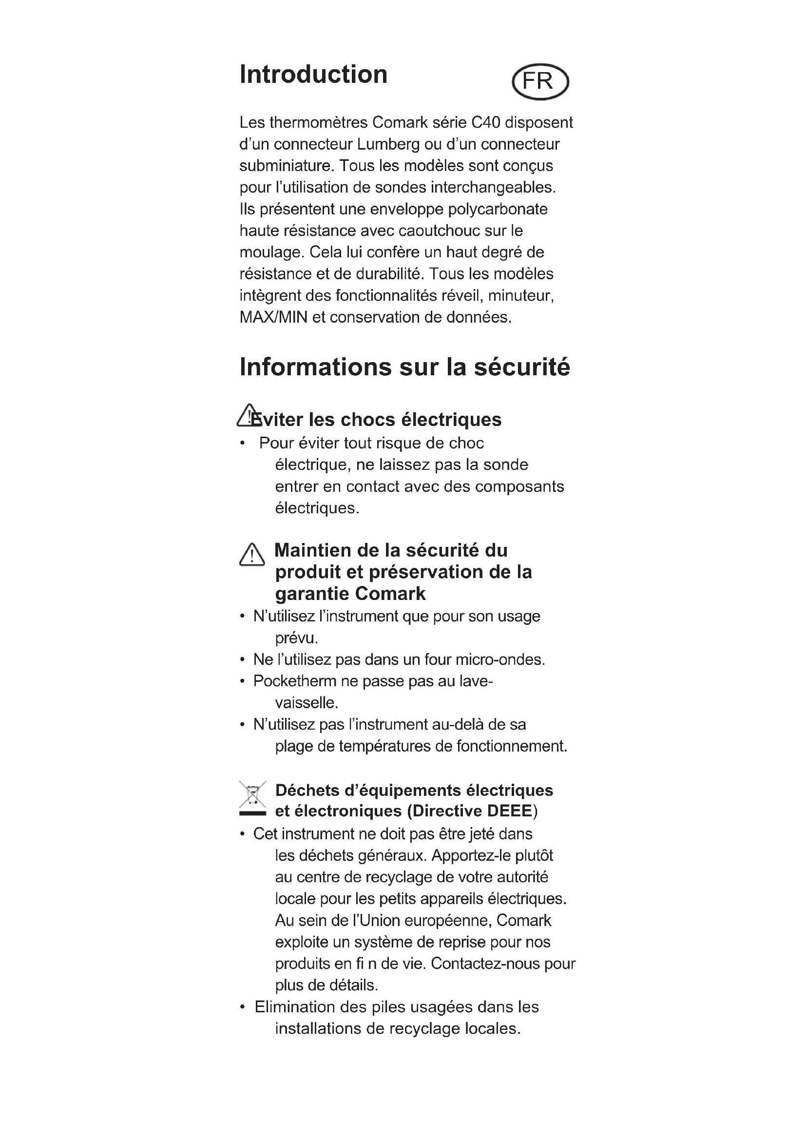 - Cet instrument ne doit pas être jeté dans les déchets généraux. Apportez-le plutôt au centre de recyclage de votre autorité locale pour les petits appareils électriques. Au sein de l’Union européenne, Comark exploite un système de reprise pour nos produits en fi n de vie. Contactez-nous pour plus de détails.
