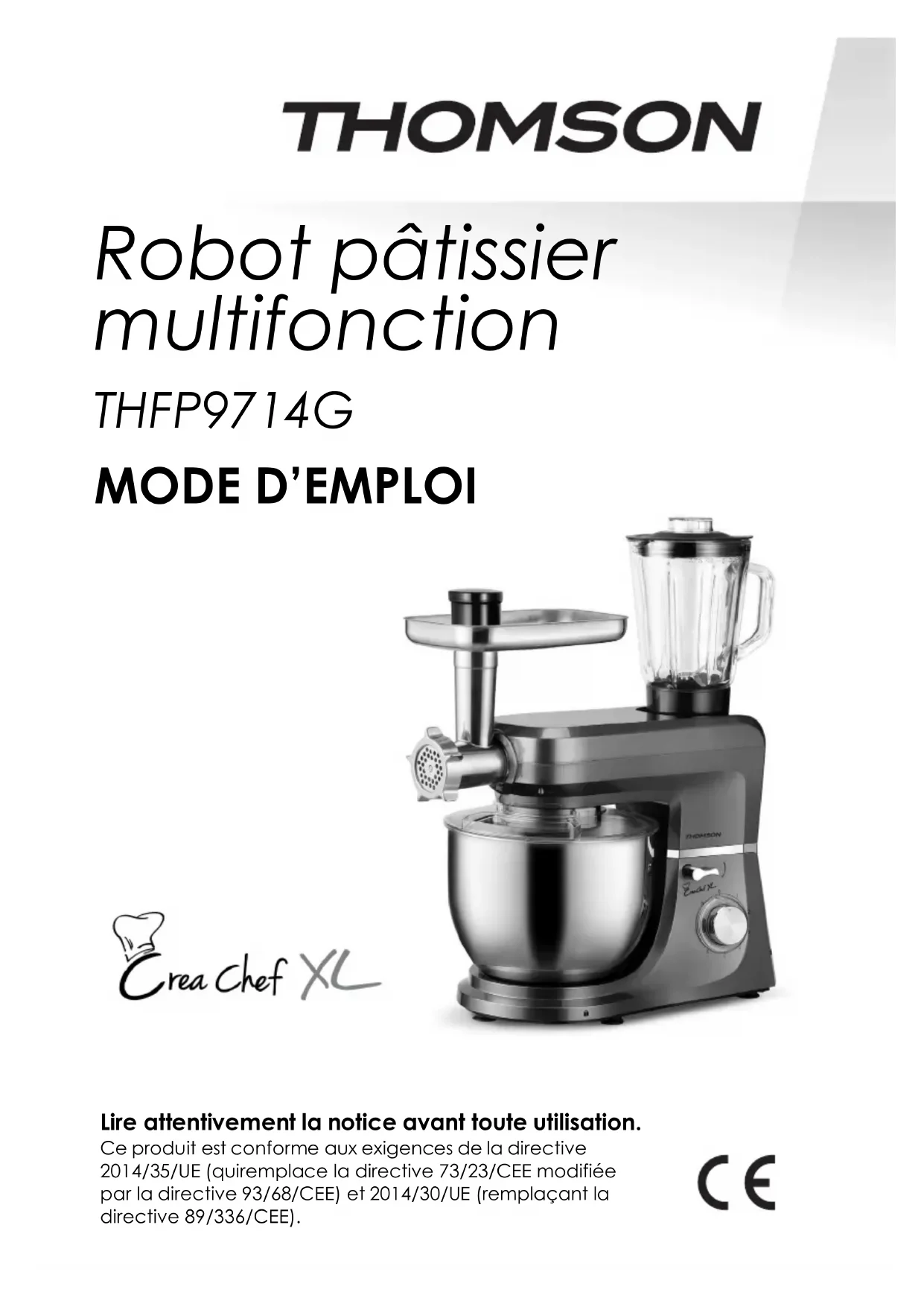 présence de substances dangereuses dans les équipements électriques et électroniques peut avoir des effets potentiels sur l’environnement et la santé humaine dans le cycle de retraitement de ce produit. Ainsi, lors de la fin de vie de cet appareil, celui-ci ne doit pas être débarrassé avec les déchets municipaux non triés. En tant que consommateur final, votre rôle est primordial dans le cycle de réutilisation, de recyclage et les autres formes de valorisation de cet équipement électrique et électronique. Des systèmes de reprise et de collecte sont mis à votre disposition par les collectivités locales (déchetteries) et les distributeurs. Vous avez l’obligation d’utiliser les systèmes de collecte sélective mise à votre disposition.La garantie ne couvre pas les pièces d’usure du produit, ni les problèmes ou les dommages résultant de : (1) Détérioration de surface due à l’usure normale du produit ; (2) Défauts ou détérioration dus au contact avec des liquides et corrosion causée par la rouille ou la présence d’insectes ; (3) Incident, abus, mauvaise utilisation, altération, démontage ou réparation non autorisée (4) Entretien inapproprié, utilisation inappropriée du produit ou branchement à une tension incorrecte ; (5) Utilisation d’accessoires non fournis ou non approuvés par le fabricant. La ga rantie sera annulée si la plaque signalétique et/ou le numéro de série du produit sont retirés. THOMSON est une marque commerciale de Technicolor SA utilisée sous licence par SCHNEIDER CONSUMER GROUP. Ce produit est importé par: SCHNEIDER CONSUMER GROUP 12, rue Jules Ferry, 93110 Rosny-sous-Bois, FRANCEMultifunction Stand Mixer THFP9714G USER MANUAL Read carefully the instructions before use. This product complies with the requirements of Directives 2014/35/EU (repealing Directive 73/23/EEC as amended by Directive 93/68/EEC) and 2014/30/EU (repealing Directive 89/336/EEC).EN-2 SAFETY INSTRUCTIONS Carefully read the instructions before putting the unit into operation and keep the instructions including the warranty, the receipt and, if possible, the box with the internal packing. If you give this device to other people, kindly also transmit the user manual.