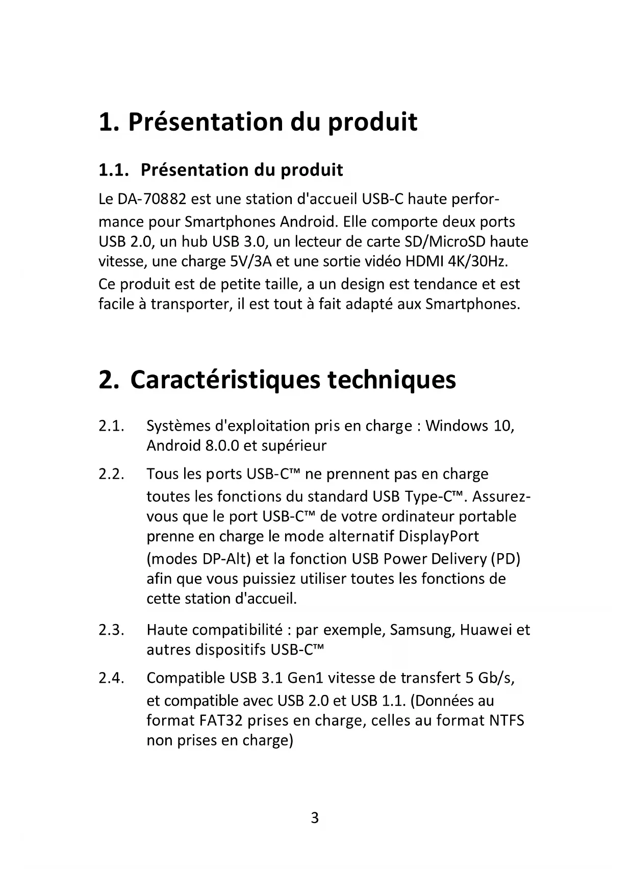 1.1. Présentation du produit Le DA-70882 est une station d'accueil USB-C haute perfor- mance pour Smartphones Android. Elle comporte deux ports USB 2.0, un hub USB 3.0, un lecteur de carte SD/MicroSD haute vitesse, une charge 5V/3A et une sortie vidéo HDMI 4K/30Hz. Ce produit est de petite taille, a un design est tendance et est facile à transporter, il est tout à fait adapté aux Smartphones.