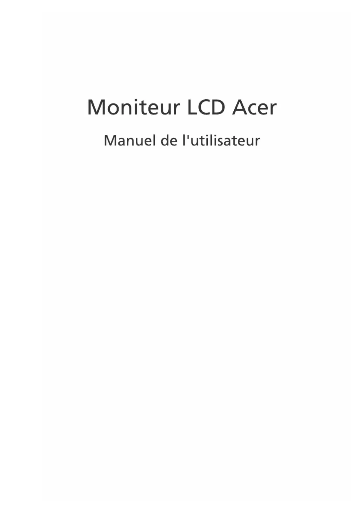 Informations concernant le recyclage des équipements TI Acer s'engage dans la protection de l'environnement et considère le recyclage, sous forme de la récupération et la mise au rebut des équipements usagés, comme l'une des principales priorités de la société, minimisant ainsi les nuisances à l'environnement. Chez Acer, nous nous soucions des effets de notre activité sur l'environnement et cherchons à identifier et à proposer les meilleures procédures de travail pour réduire l'impact environnement de nos produits. Pour plus d'informations et pour obtenir de l'aide lors du recyclage, veuillez consulter ce site Web : Visitez www.acer-group.com pour en savoir plus sur les caractéristiques et les avantages de nos autres produits. Ce symbole sur le produit ou sur son emballage indique que ce produit ne doit pas être jeté avec les autres déchets ménagers. Au lieu de cela, il est de votre responsabilité d'éliminer les déchets d'équipements en les remettant à un point de collecte désigné pour le recyclage des équipements électriques et électroniques. La collecte séparée et le recyclage des équipements usagés contribueront à la conservation des ressources naturelles et assureront leur traitement de manière écologique, protégeant ainsi la santé humaine et l'environnement. Pour plus d'informations sur les lieux de mise au rebut des équipements de recyclage usagés, veuillez contacter votre bureau local, le service d'élimination des déchets ménagers ou le magasin où vous avez acheté le produit. L'unité LCD est produite en utilisant des techniques de fabrication de haute précision. Cependant, certains pixels peuvent parfois se déformer ou apparaître sous forme de points noirs ou rouges. Cela n'a aucun effet sur l'image enregistrée et ne constitue pas un dysfonctionnement. Ce produit est livré avec la fonction de gestion de l'alimentation activée: la souris ou en appuyant sur n'importe quelle touche du clavier.4* Les éléments présentés ci-dessous ne sont qu'à titre indicatif. Le produit réel peut être différent. Moniteur LCP Guide de démarrage rapide Cordon d'alimentation CA (en option) Adaptateur secteur (en option) Câble D-Sub (en option) Câble DP (en option) Câble audio (en option) Câble HDMI (en option)Fixez la base au bras de la base du support du moniteur.Suivez ces instructions pour détacher la base du moniteur. Appuyez et dévissez le loquet avec un tournevis. Faites glisser dans le sens de la flèche, puis retirez la base du support du moniteur. Remarque: placez soigneusement le moniteur face vers le bas sur une surface stable, utilisez un chiffon doux pour éviter de rayer l'écran.RÉGLAGE DE LA POSITION DU MONITEUR Afin d'optimiser la meilleure position de visualisation, vous pouvez régler la hauteur / l'inclinaison du moniteur. Veuillez consulter l'illustration ci-dessous pour avoir un exemple de la plage d'inclinaison. InclinaisonLe moniteur est basculé en mode "Economie d’énergie" par le signal de La LED clignoteNo Remarque Mode Résolution1. Éteignez votre moniteur et débranchez le cordon d’alimentation de votre ordinateur.