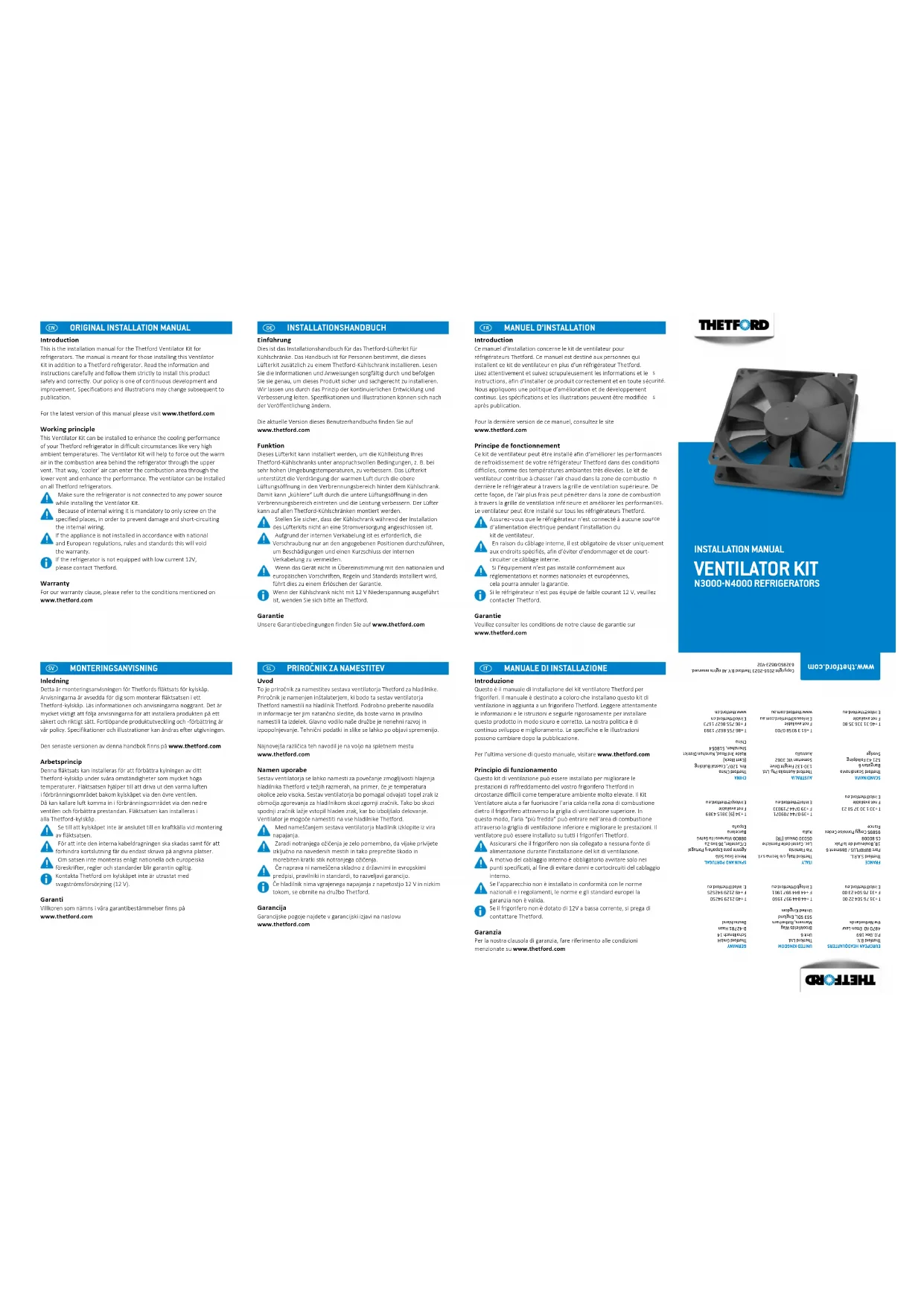 MANUELD’INSTALLATION Introduction Ce manuel d’installation concerne le kit de ventilateur pour réfrigérateurs Thetford. Ce manuel est destiné aux personnes qui installent ce kit de ventilateur en plus d’un réfrigérateur Thetford. Lisez attentivement et suivez scrupuleusement les informations et les instructions, afin d’installer ce produit correctement et en toute sécurité. Nous appliquons une politique d’amélioration et de développement continus. Les spécifications et les illustrations peuvent être modifiées après publication. Pour la dernière version de ce manuel, consultez le site www.thetford.com Principe de fonctionnement Ce kit de ventilateur peut être installé afin d’améliorer les performances de refroidissement de votre réfrigérateur Thetford dans des conditions difficiles, comme des températures ambiantes très élevées. Le kit de ventilateur contribue à chasser l’air chaud dans la zone de combustion derrière le réfrigérateur à travers la grille de ventilation supérieure. De cette façon, de l’air plus frais peut pénétrer dans la zone de combustion à travers la grille de ventilation inférieure et améliorer les performances. Le ventilateur peut être installé sur tous les réfrigérateurs Thetford. Assurez-vous que le réfrigérateur n’est connecté à aucune source d’alimentation électrique pendant l’installation du kit de ventilateur. En raison du câblage interne, il est obligatoire de visser uniquement aux endroits spécifiés, afin d’éviter d’endommager et de court-circuiter ce câblage interne. Si l’équipement n’est pas installé conformément aux réglementations et normes nationales et européennes, cela pourra annuler la garantie.Si le réfrigérateur n’est pas équipé de faible courant 12 V, veuillez contacter Thetford. Garantie Veuillez consulter les conditions de notre clause de garantie sur www.thetford.com