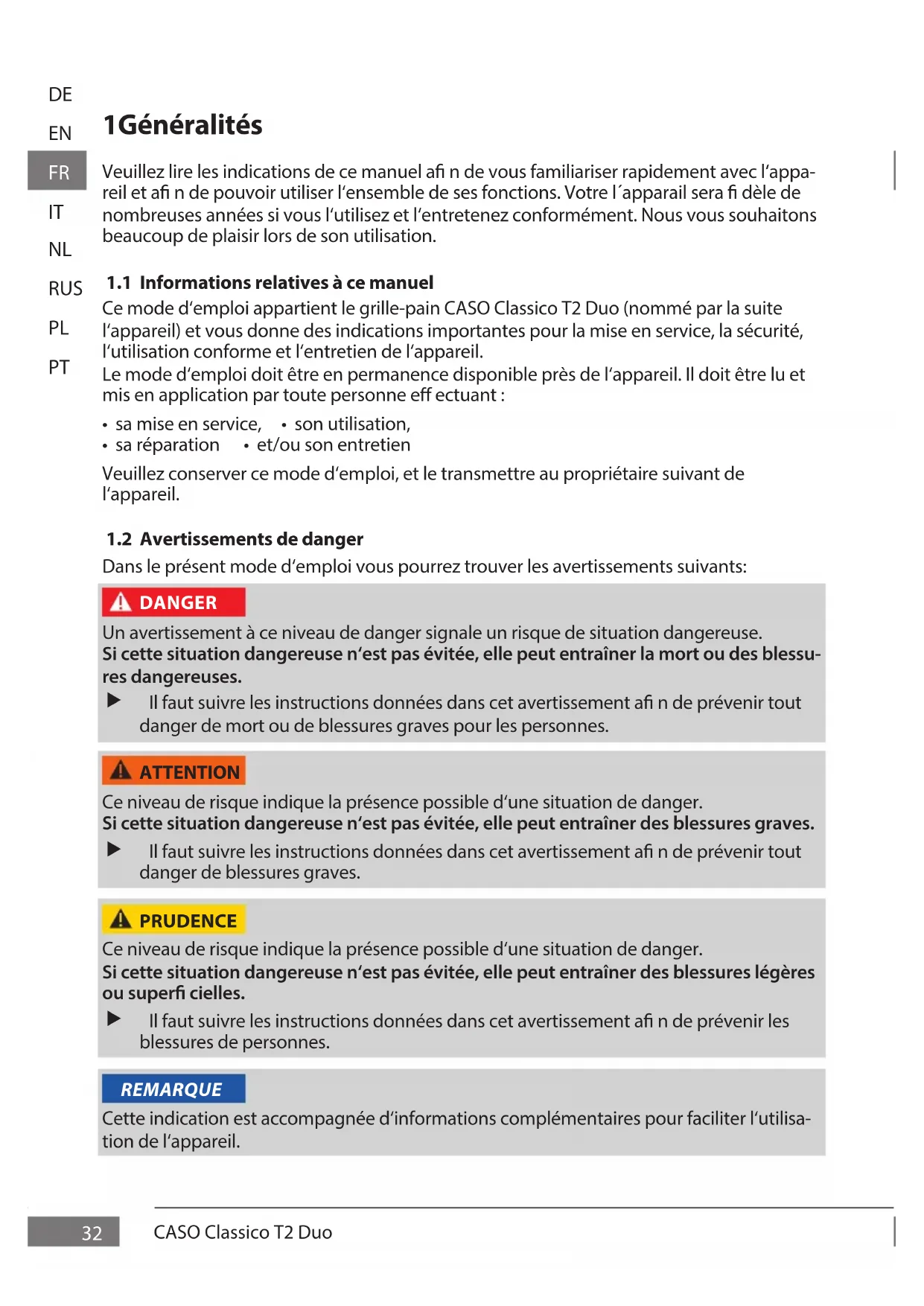 Dans le présent mode d‘emploi vous pourrez trouver les avertissements suivants: Un avertissement à ce niveau de danger signale un risque de situation dangereuse. Si cette situation dangereuse n‘est pas évitée, elle peut entraîner la mort ou des blessu- res dangereuses. Il faut suivre les instructions données dans cet avertissement a n de prévenir tout danger de mort ou de blessures graves pour les personnes. Ce niveau de risque indique la présence possible d‘une situation de danger. Si cette situation dangereuse n‘est pas évitée, elle peut entraîner des blessures graves. Il faut suivre les instructions données dans cet avertissement a n de prévenir tout danger de blessures graves. Ce niveau de risque indique la présence possible d‘une situation de danger. Si cette situation dangereuse n‘est pas évitée, elle peut entraîner des blessures légères ou super cielles. Il faut suivre les instructions données dans cet avertissement a n de prévenir les blessures de personnes. Cette indication est accompagnée d‘informations complémentaires pour faciliter l‘utilisa- tion de l‘appareil. DANGER ATTENTION PRUDENCE REMARQUECASO Classico T2 Duo