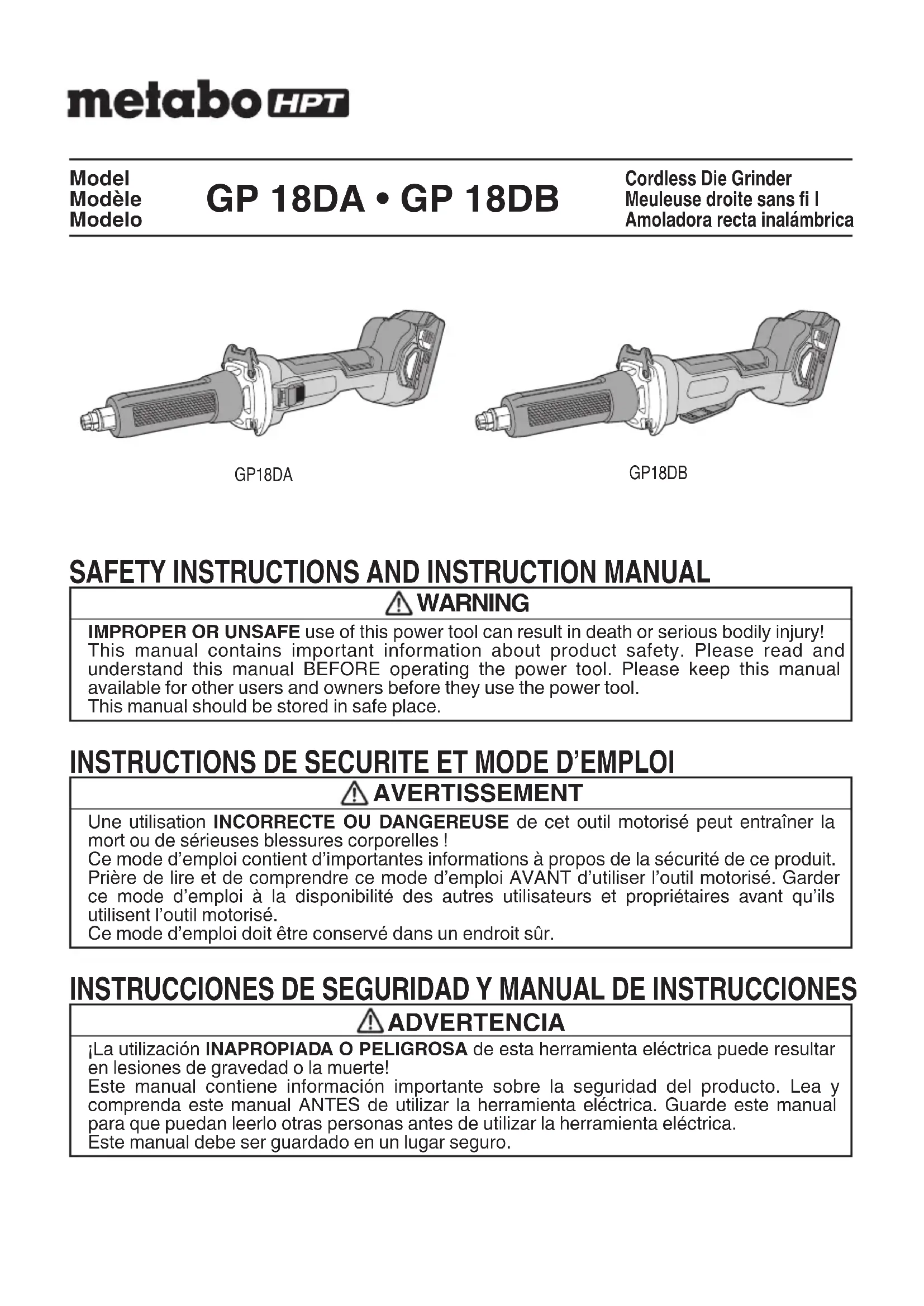 Tous les outils motorisés de qualité auront éventuellement besoin d’une réparation ou du remplacement d’une pièce à cause de l’usure normale de l’outil. Pour assurer que seules des pièces de rechange autorisées seront utilisées, tous les entretiens et les réparations doivent être eff ectués uniquement par UN CENTRE DE SERVICE metabo HPT AUTORISÉ. PRECAUTION Lors de l’utilisation et de l’entretien d’un outil électrique, respecter les règlements et les normes de sécurité en vigueur dans le pays en question. Avis important sur les batteries pour outils électriques sans fi l metabo HPT Toujours utiliser une de nos batteries originales spécifiées. Nous ne saurions garantir la sécurité et la performance de notre outil électrique sans fil s’il est utilisé avec une batterie autre que celle que nous avons spécifi é, ou encore si la batterie est démontée et modifi ée (par exemple, le démontage et remplacement des cellules ou autres composants internes). 00BookGP18DANA.indb4000BookGP18DANA.indb40 2021/03/0416:27:582021/03/0416:27:5841 Français ACCESSOIRES AVERTISSEMENT TOUJOURS utiliser UNIQUEMENT des pièces de rechange et des accessoires metabo HPT. NE JAMAIS utiliser de pièce de rechange ou d’accessoires qui ne sont pas prévus pour être utilisé avec cet outil. En cas de doute, contacter metabo HPT pour savoir si une pièce de rechange ou un accessoire particulier peuvent être utilisés en toute sécurité avec votre outil. L’utilisation de tout autre attachement ou accessoire peut être dangereux et peut causer des blessures ou des dommages mécaniques. REMARQUE Les accessoires sont sujets à changement sans obligation de la part de metabo HPT. ACCESSOIRES STANDARD GP18DA GP18DB (NN) (1) Clé (43/64"(17 mm)) (No. de code 936638) ..........................................................1 (2) Clé (15/32"(12 mm)) (No. de code 936553) ..........................................................1 La batterie, le chargeur de batterie et le couvercle de la batterie ne sont pas inclus. ACCESSOIRES SUR OPTION…vendus séparément (1) Batterie (BSL1830C) (2) Chargeur de batterie (UC18YFSL) (3) Couvercle de batterie (No. de code 329897) (4) Mandrino à collet (pour axe de 1/8" (3,175 mm)) Les dimensions et les méthodes de manipulation, à l’exception du trou d’axe sont les mêmes que celles du mandrin à collet de 1/4"(6 mm). (5) Poignée latérale (No. de code 329758) REMARQUE Les spécifi cations sont sujettes à modifi cation sans aucune obligation de la part de metabo HPT. 00BookGP18DANA.indb4100BookGP18DANA.indb41 2021/03/0416:27:582021/03/0416:27:5842 Español
