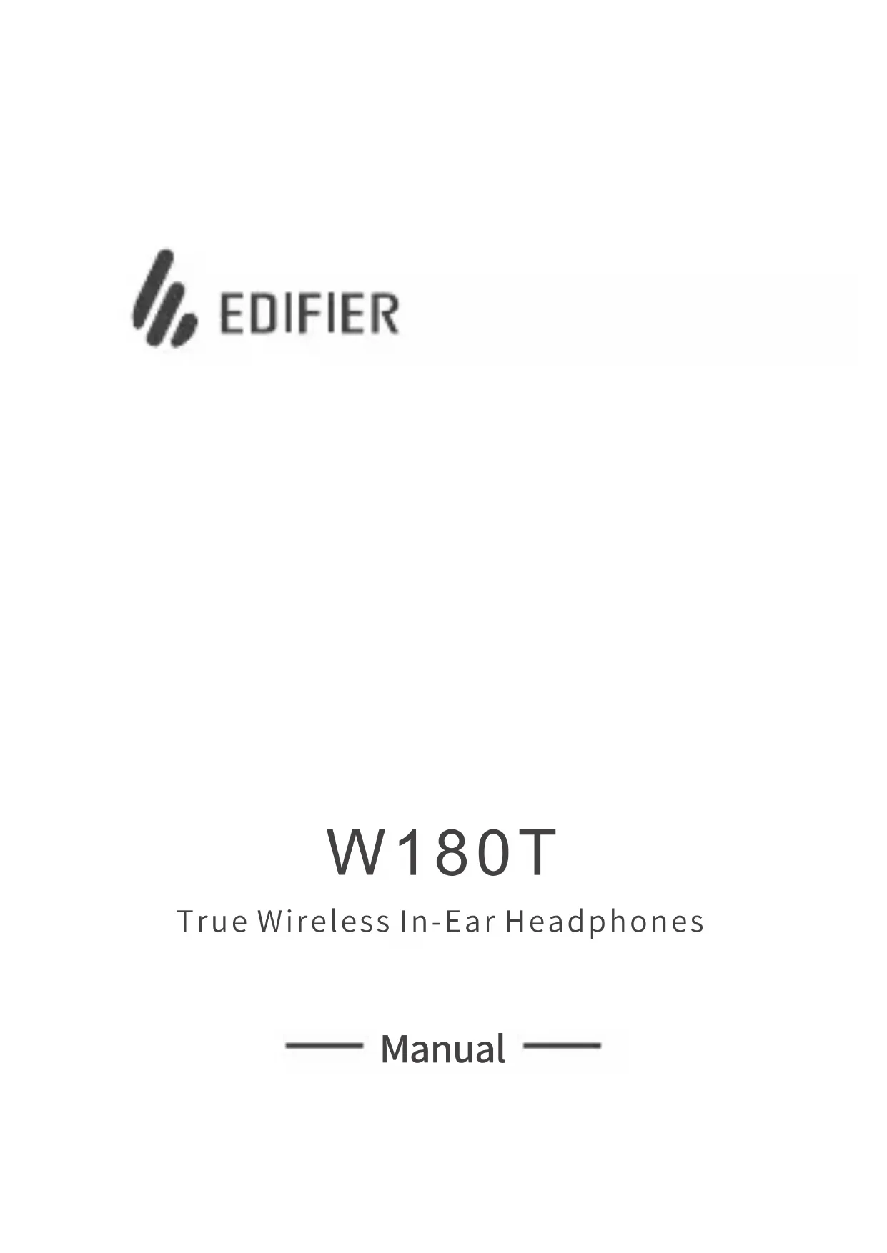 Controls x1x1 x3 x3 x2 x2 2s 2s x1x1 x1x1 2s2sModel: EDF2000725 Edif ier International Limited P.O. Box 6264 General Post Office Hong Kong www.edif ier.com © 2021 Edif ier International Limited. All rights reserved. Printed in China NOTICE: For the need of technical improvement and system upgrade, information contained herein may be subject to change from time to time without prior notice. Products of EDIFIER will be customized for different applications. Pictures and illustrations shown on this manual may be slightly different from actual product. If any difference is found, the actual product prevails. For more information, please visit our website: www.edifier.com @Edif ierglobal @Edif ier_Global @Edif ier_GlobalAppairage 1. Sortis de l'étui.2. Maintenez la pression sur la zone tactile d'un des écouteurs pendant 1 à 3 secondes. Les LED rouge et bleue clignoteront rapidement.3. Sélectionnez « EDIFIER W180T L » ou « EDIFIER W180T R » dans les paramètres de votre appareil pour établir la connexion. Première association1. Sortis de l'étui. Les LED rouge et bleue clignoteront rapidement.2. Sélectionnez « EDIFIER W180T L » ou « EDIFIER W180T R » dans les paramètres de votre appareil pour établir la connexion.Remarque: 1. Les écouteurs se connecteront automatiquement au dernier appareil associé lorsque vous les allumerez dans le futur.2. Après avoir terminé l'association Bluetooth entre cet écouteur et le téléphone mobile, vous pouvez effectuer ces étapes de nouveau pour associer l'autre écouteur au téléphone pour qu'ils puissent fonctionner indépendamment. 1-3s 1-3s Indicateur Indicateur