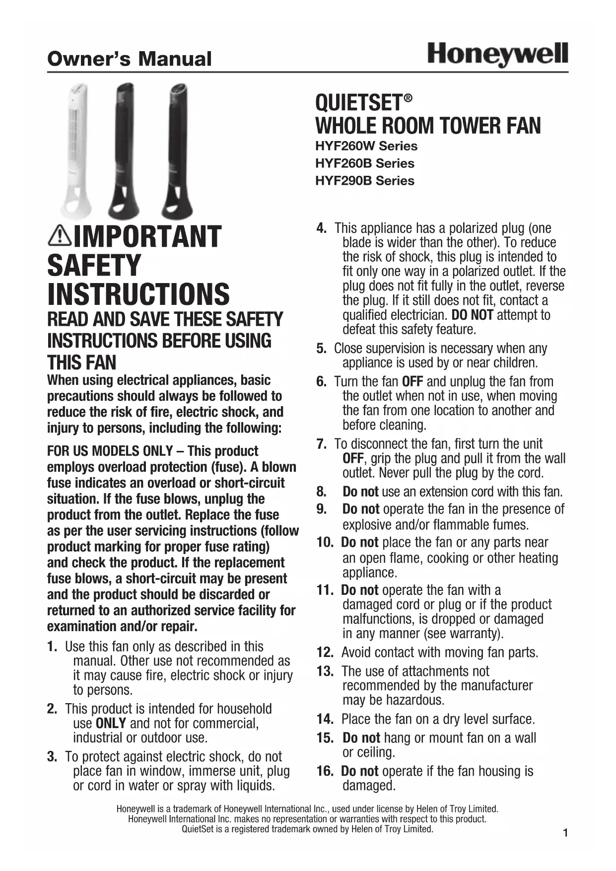Retrouvez gratuitement la notice de l'appareil QuietSet 5 HYF260 HONEYWELL au format PDF.
