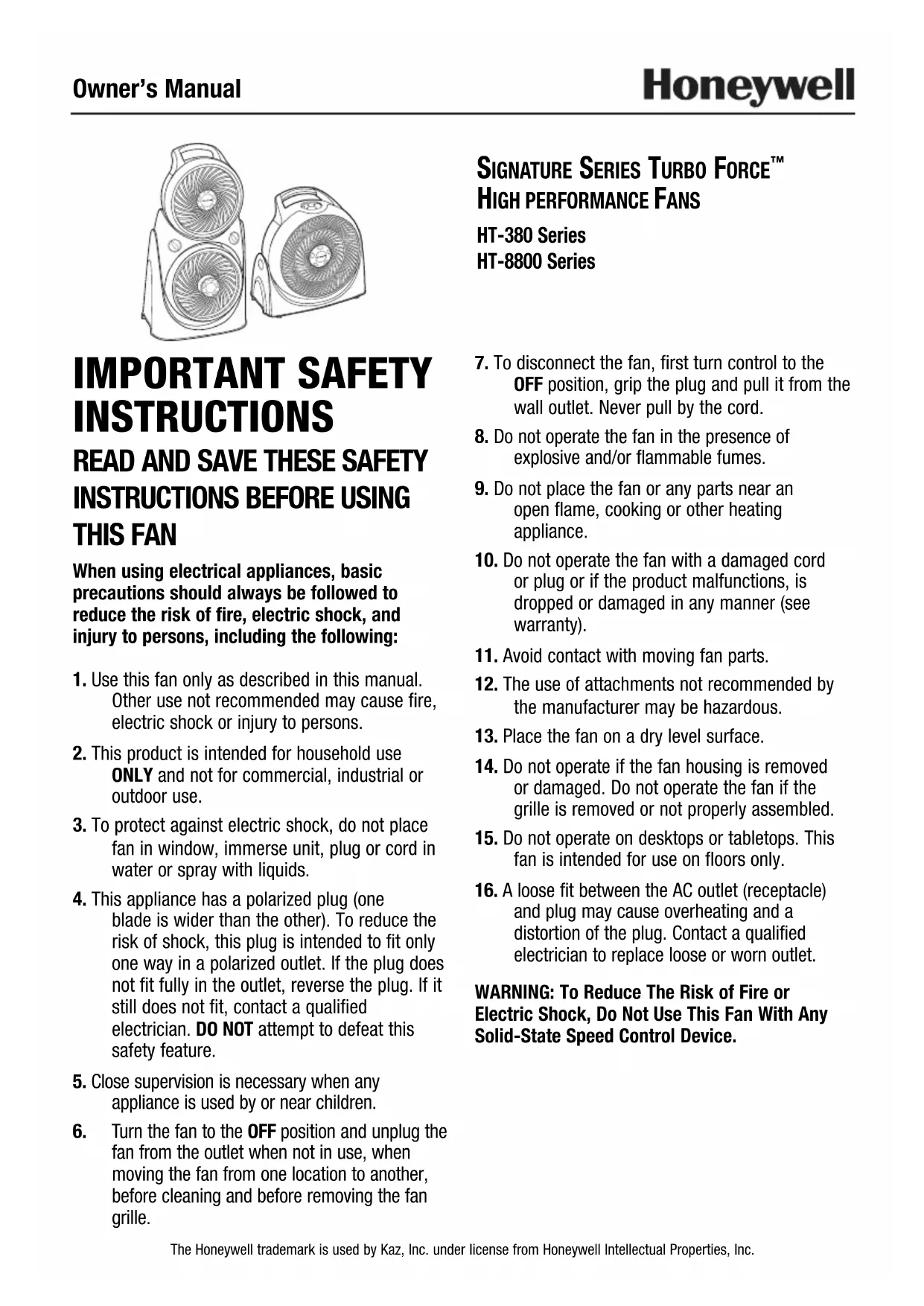 Série HT-380 Série HT-8800 La marque de commerce Honeywell est utilisée par Kaz, Inc. avec l'autorisation de Honeywell Intellectual Properties, Inc. IMPORTANTES INSTRUCTIONS