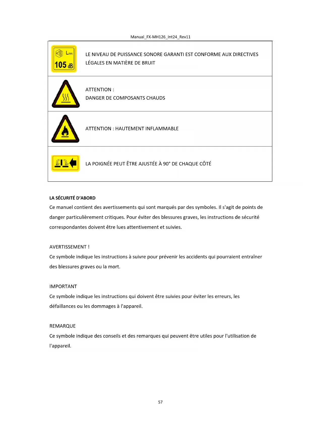 Ce manuel contient des avertissements qui sont marqués par des symboles. Il s'agit de points de danger particulièrement critiques. Pour éviter des blessures graves, les instructions de sécurité correspondantes doivent être lues attentivement et suivies. AVERTISSEMENT ! Ce symbole indique les instructions à suivre pour prévenir les accidents qui pourraient entraîner des blessures graves ou la mort. IMPORTANT Ce symbole indique les instructions qui doivent être suivies pour éviter les erreurs, les défaillances ou les dommages à l'appareil. REMARQUE Ce symbole indique des conseils et des remarques qui peuvent être utiles pour l'utilisation de l'appareil.Manual_FX-MH126_Int24_Rev11
