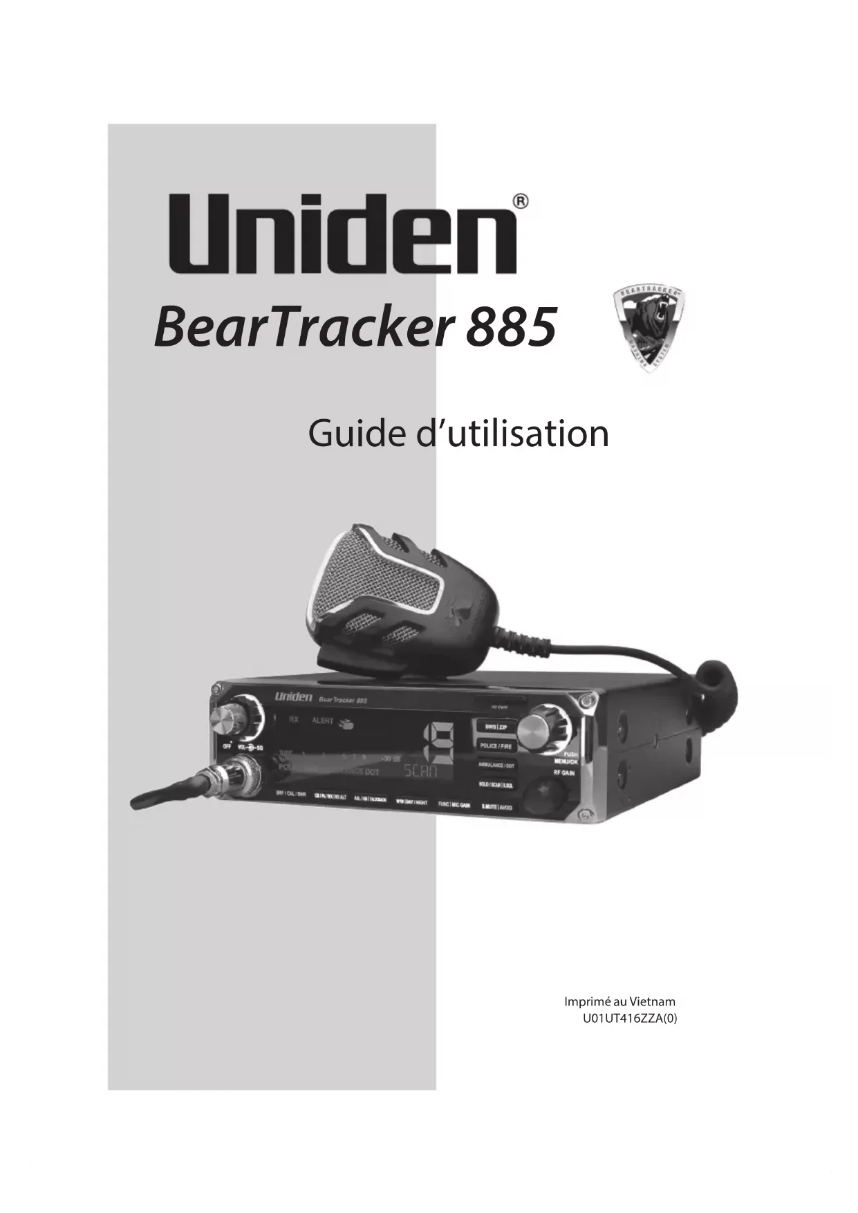 Guide d’utilisation Imprimé au Vietnam U01UT416ZZA(0) BearTracker 885©2017 Uniden America Corporation Uniden est une marque de commerce de Uniden American Corporation. Les caractéristiques, spéciations et la disponibilité des accessoires supplémentaires peuvent varier sans préavis.CONTENU SURVOL ....................................................................................... 5