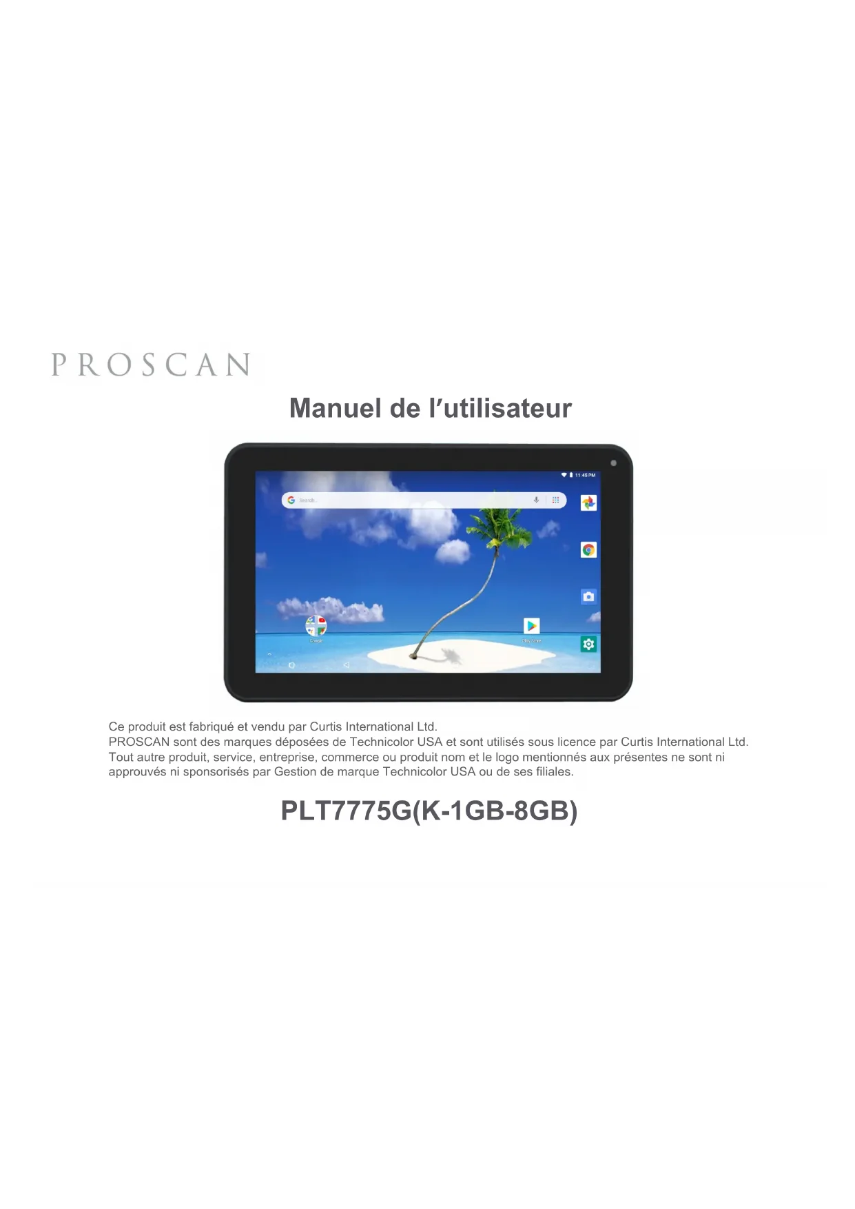 PLT7775G(K-1GB-8GB) Manuel de l’utilisateur Ce produit est fabriqué et vendu par Curtis International Ltd. PROSCAN sont des marques déposées de Technicolor USA et sont utilisés sous licence par Curtis International Ltd. Tout autre produit, service, entreprise, commerce ou produit nom et le logo mentionnés aux présentes ne sont ni approuvés ni sponsorisés par Gestion de marque Technicolor USA ou de ses filiales.0 0DQXHOGHOXWLOLVDWHXU