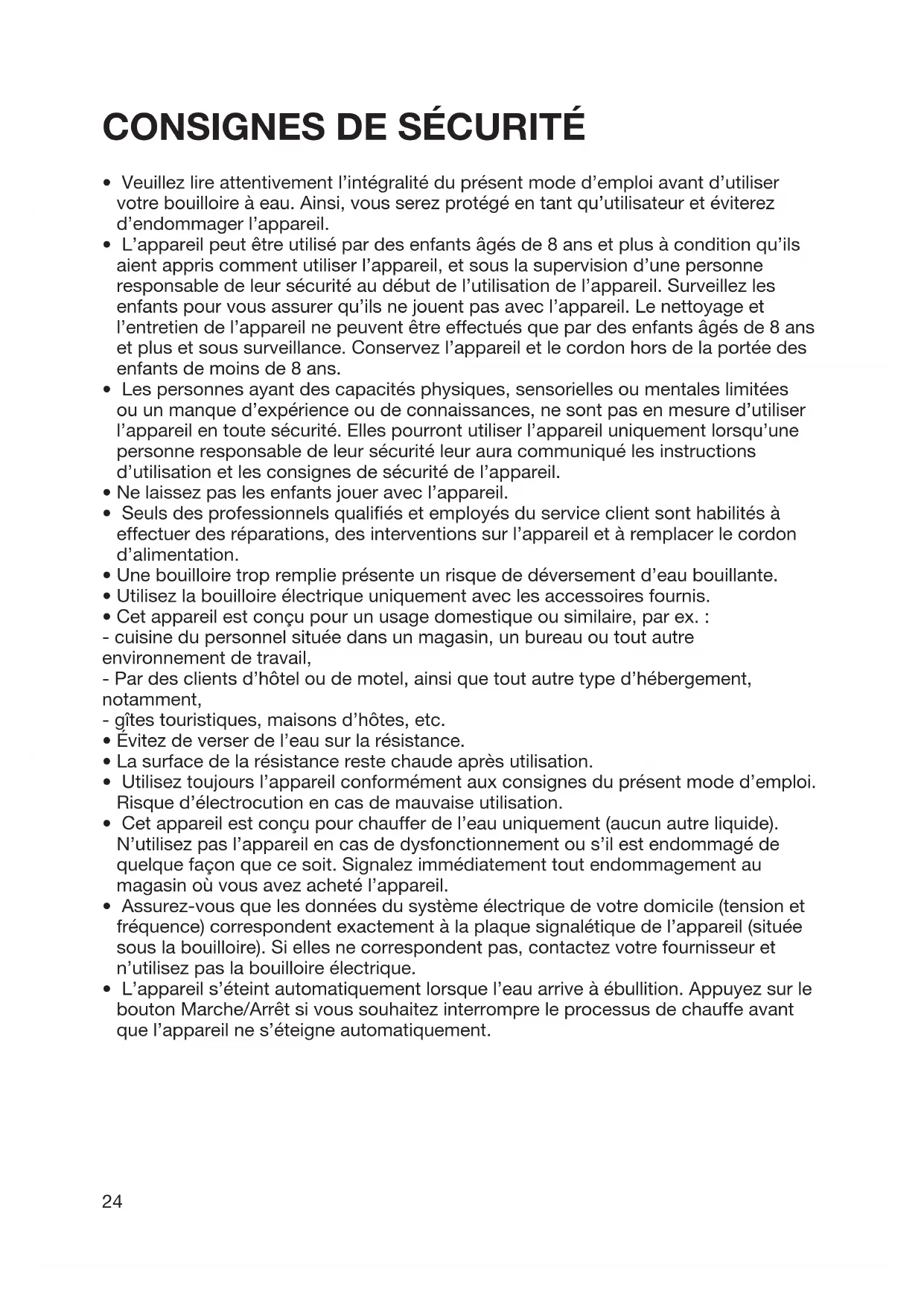 - Veuillez lire attentivement l’intégralité du présent mode d’emploi avant d’utiliser votre bouilloire à eau. Ainsi, vous serez protégé en tant qu’utilisateur et éviterez d’endommager l’appareil.