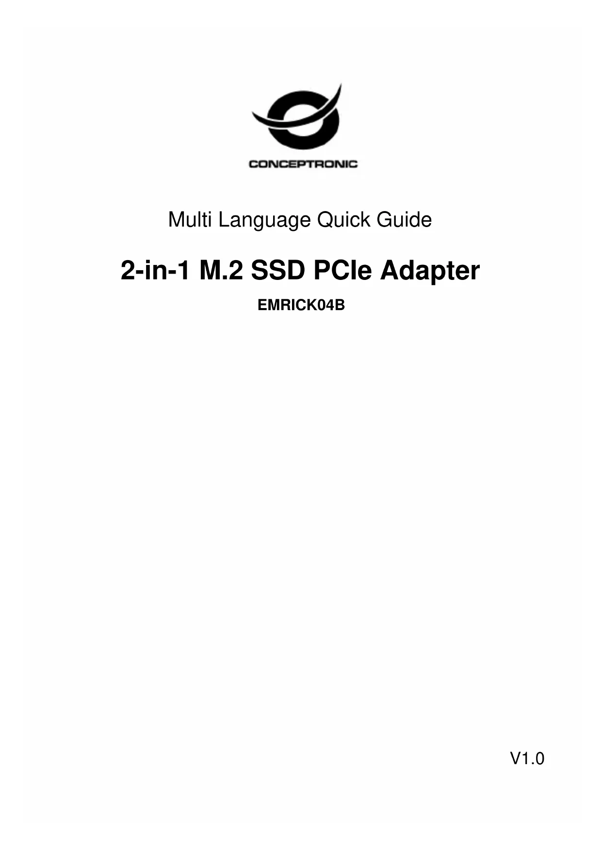 Cet adaptateur PCIe SSD M.2 2-en-1 est une carte de conversion NVMe multifonction, qui peut prendre en charge le SSD NVMe au protocole PCIe afin de se connecter directement à la carte mère, ou le SSD NVMe au protocole SATA pour se connecter au port SATA de la carte mère avec un câble SATA. Installation du SSD M.2 M Key et du SSD M.2 B Key dans l'adaptateur PCIe. Allumez l'alimentation de votre ordinateur. Débranchez le cordon d'alimentation et enlevez le capot de votre ordinateur. Retirez le cache du slot d'un emplacement PCIe disponible. Pour installer la carte, alignez soigneusement le connecteur bus de la carte avec le slotPCIe sélectionné sur la carte mère. Enfoncez la carte fermement. Utilisation du câble SATA pour connecter l'adaptateur NVMe au port SATA de la carte mère. Remettez en place la vis du cache du slot pour fixer la carte. Remettez en place le capot de l'ordinateur, puis rebranchez le cordon d'alimentation.ESPAÑ OL Conceptronic EMRICK04B Instalación & Utilización
