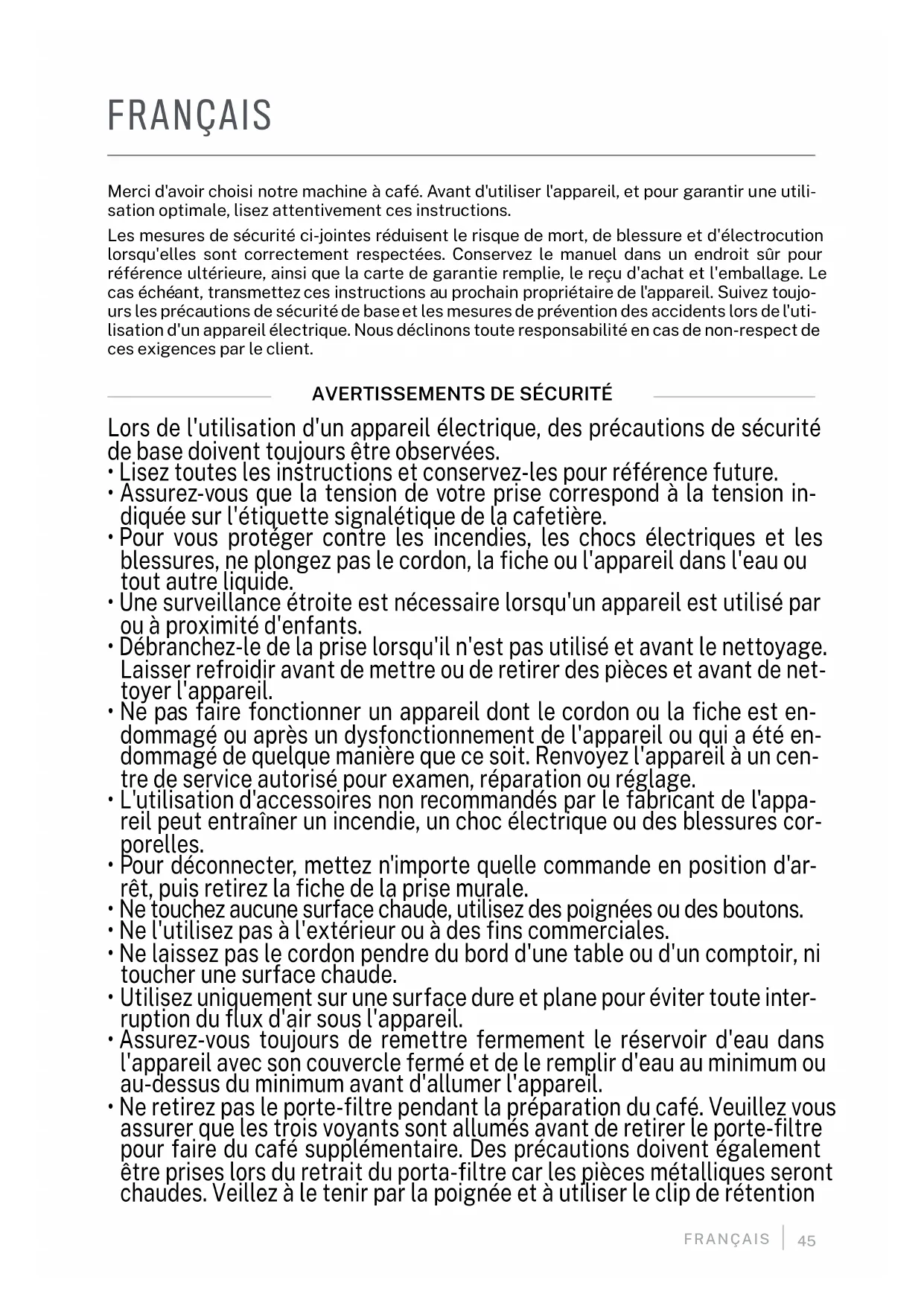 Merci d'avoir choisi notre machine à café. Avant d'utiliser l'appareil, et pour garantir une utili- sation optimale, lisez attentivement ces instructions. Les mesures de sécurité ci-jointes réduisent le risque de mort, de blessure et d'électrocution lorsqu'elles sont correctement respectées. Conservez le manuel dans un endroit sûr pour référence ultérieure, ainsi que la carte de garantie remplie, le reçu d'achat et l'emballage. Le cas échéant, transmettez ces instructions au prochain propriétaire de l'appareil. Suivez toujo- urs les précautions de sécurité de base et les mesures de prévention des accidents lors de l'uti- lisation d'un appareil électrique. Nous déclinons toute responsabilité en cas de non-respect de ces exigences par le client. Lors de l'utilisation d'un appareil électrique, des précautions de sécurité de base doivent toujours être observées.