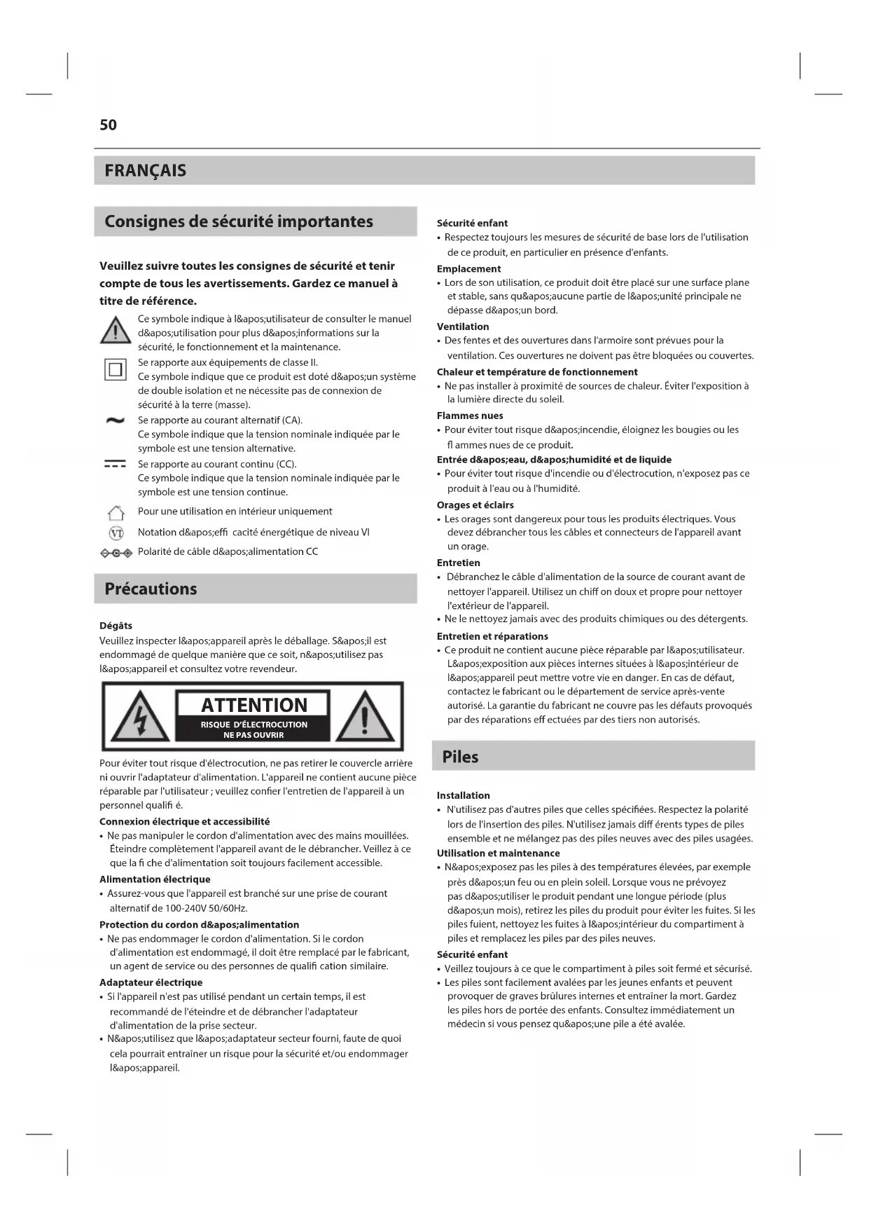 - Ce produit ne contient aucune pièce réparable par l'utilisateur. L'exposition aux pièces internes situées à l'intérieur de l'appareil peut mettre votre vie en danger. En cas de défaut, contactez le fabricant ou le département de service après-vente autorisé. La garantie du fabricant ne couvre pas les défauts provoqués par des réparations e ectuées par des tiers non autorisés. Piles Installation