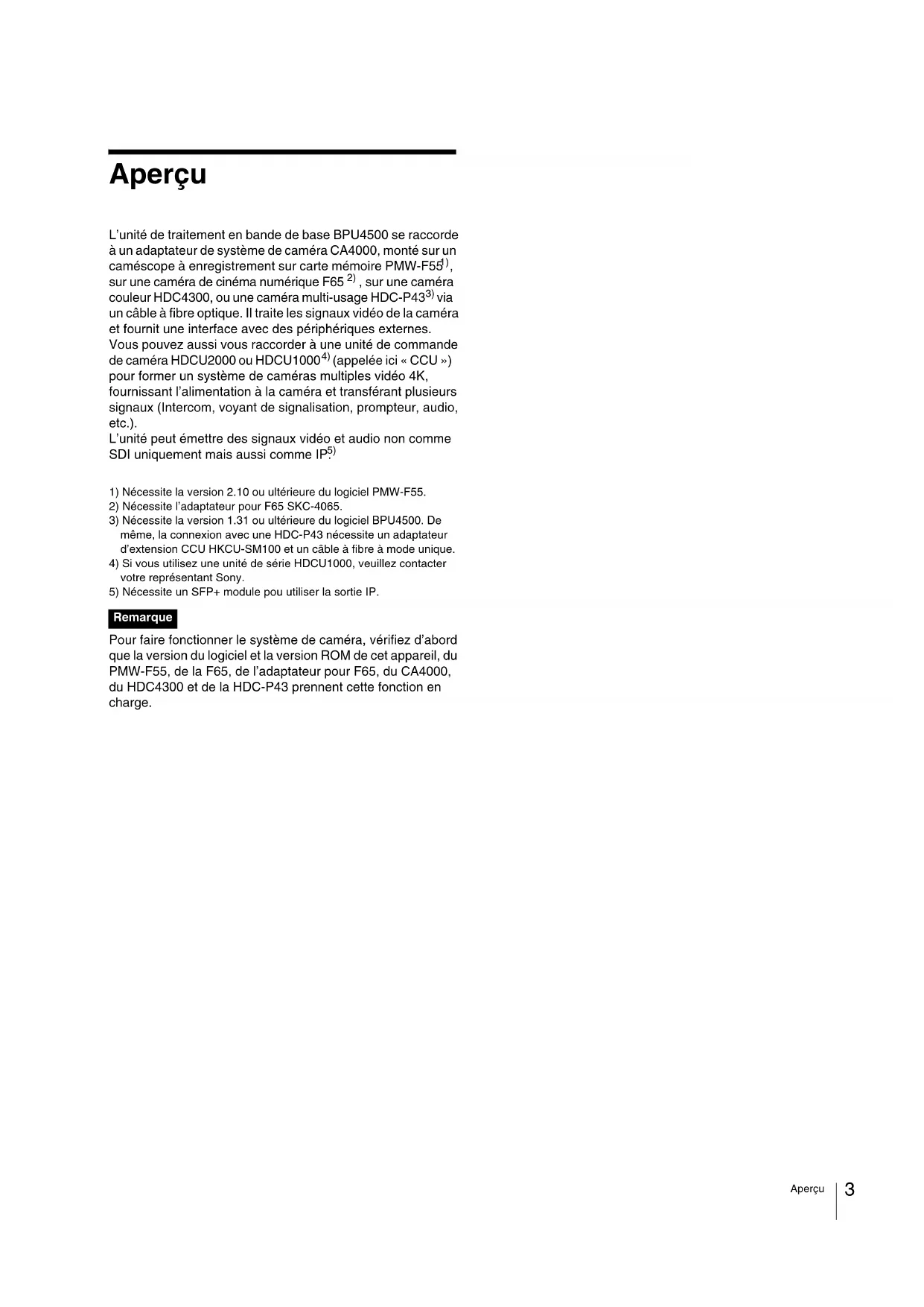 Pour faire fonctionner le système de caméra, vérifiez d’abord que la version du logiciel et la version ROM de cet appareil, du PMW-F55, de la F65, de l’adaptateur pour F65, du CA4000, du HDC4300 et de la HDC-P43 prennent cette fonction en charge. Remarque4 Aperçu Configuration du système La production de certains des périphériques et dispositifs associés illustrés dans les figures a peut-être cessé. Pour obtenir des conseils sur le choix des dispositifs, veuillez contacter votre représentant Sony. Exemple de connexion du PMW-F55 Exemple de connexion du PMW-F55 et de l’HDCU2000/2500 pour le fonctionnement comme caméra de système. Remarque ObjectifAdaptateur épaule VCT-FSA5TrépiedHDVF-EL75/L750/L770DVF-L700 ViseurCâble de fibre optiqueDVF-EL100DVF-L350 ViseurUnité de commande de caméra HDCU2000 BNC Unité de commande de caméra HDCU2500Unité de configuration principale de la série MSU-1000a) Utilisez un support d’objectif du même fabricant que l’objectif lors du montage d’un objectif de caméra de studio sur un trépied.b) Fixez un kit d’amplification de puissance de caméra SKC-PB40 (en option) à l’appareil pour fournir l’alimentation aux objectifs de caméra de studio.c) Utilisez un adaptateur pour monture d’objectif LA-FZB2 (en option) lors de l’utilisation d’un objectif de 2/3 de pouce.d) Installez la carte de conversion NXLK-IP40F SDI-IP (en option).Panneau de télécommande série RCP-1000 BNC Moniteur vidéoMoniteur de forme d’ondeRouteur vidéoCCA-5Câble LANCâble de fibre optiqueConcentrateurPanneau de télécommande série RCP-1000CCA-5Clé USBObjectif (pour caméra de studio)a) b) c)Sélecteur de retour vidéo CAC-6Casque intercomMicrophoneSélecteur de retour vidéo CAC-6Casque intercomSupport de microphone CAC-12MicrophoneClé USBHDVF-EL75/L750/L770DVF-L700ViseurDVF-EL100DVF-L350ViseurEntrée de signal SyncEntrée de retour vidéoEntrée de microphone IntercomCaméscope à enregistrement sur carte mémoire PMW-F55BPU4500Adaptateur de système de caméra CA4000BNC × 4Moniteur vidéo 2K BNC Moniteur vidéo 4KCâble LANAdaptateur de trépied VCT-14Adaptateur épaule VCT-FSA5TrépiedCaméscope à enregistrement sur carte mémoire PMW-F55 + LA-FZB2Adaptateur de système de caméra CA4000 +SKC-PB40Adaptateur de trépied VCT-14 Entrée de signal SyncEntrée de retour vidéoEntrée de microphone IntercomPWS-100NM1 IP Live System Manager Station Unité de traitement de signal NXL-FR318 Commutateur de réseauCâble de fibre optique5 Aperçu Exemples de connexion de mode d’extension Exemple de connexion sans HDCU2000/2500 pour le fonctionnement comme unité d’extension de caméra. Caméscope à enregistrement sur carte mémoire PMW-F55 Câble de fibre optique BPU4500 Adaptateur de système de caméra CA4000 Moniteur vidéo 2K Entrée d’alimentation CD Moniteur vidéo 4K Objectif