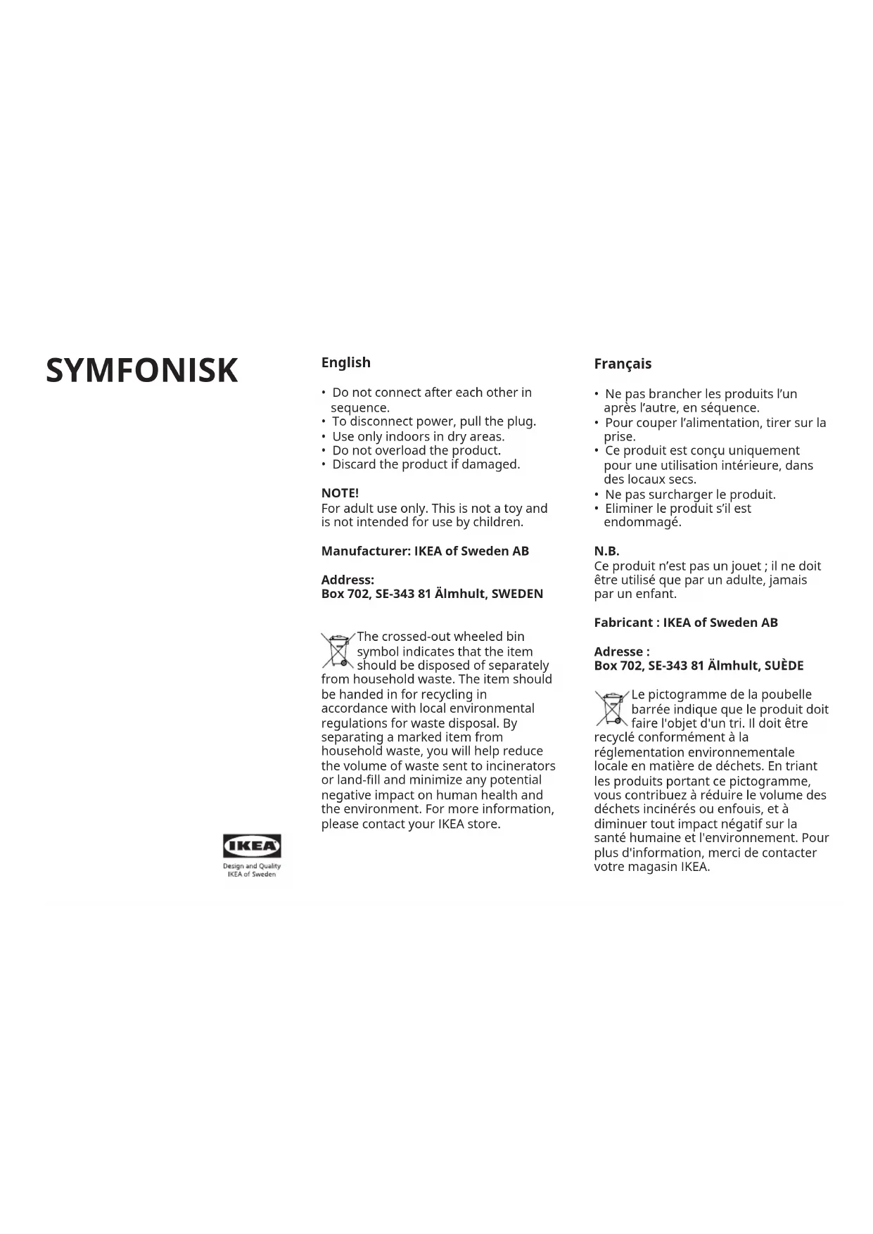 - Eliminer le produit s’il est endommagé. N.B. Ce produit n’est pas un jouet ; il ne doit être utilisé que par un adulte, jamais par un enfant. Fabricant : IKEA of Sweden AB Adresse : Box 702, SE-343 81 Älmhult, SUÈDE Le pictogramme de la poubelle barrée indique que le produit doit faire l'objet d'un tri. Il doit être recyclé conformément à la réglementation environnementale locale en matière de déchets. En triant les produits portant ce pictogramme, vous contribuez à réduire le volume des déchets incinérés ou enfouis, et à diminuer tout impact négatif sur la santé humaine et l'environnement. Pour plus d'information, merci de contacter votre magasin IKEA.© Inter IKEA Systems B.V. 2020 AA-2223630-2 Español