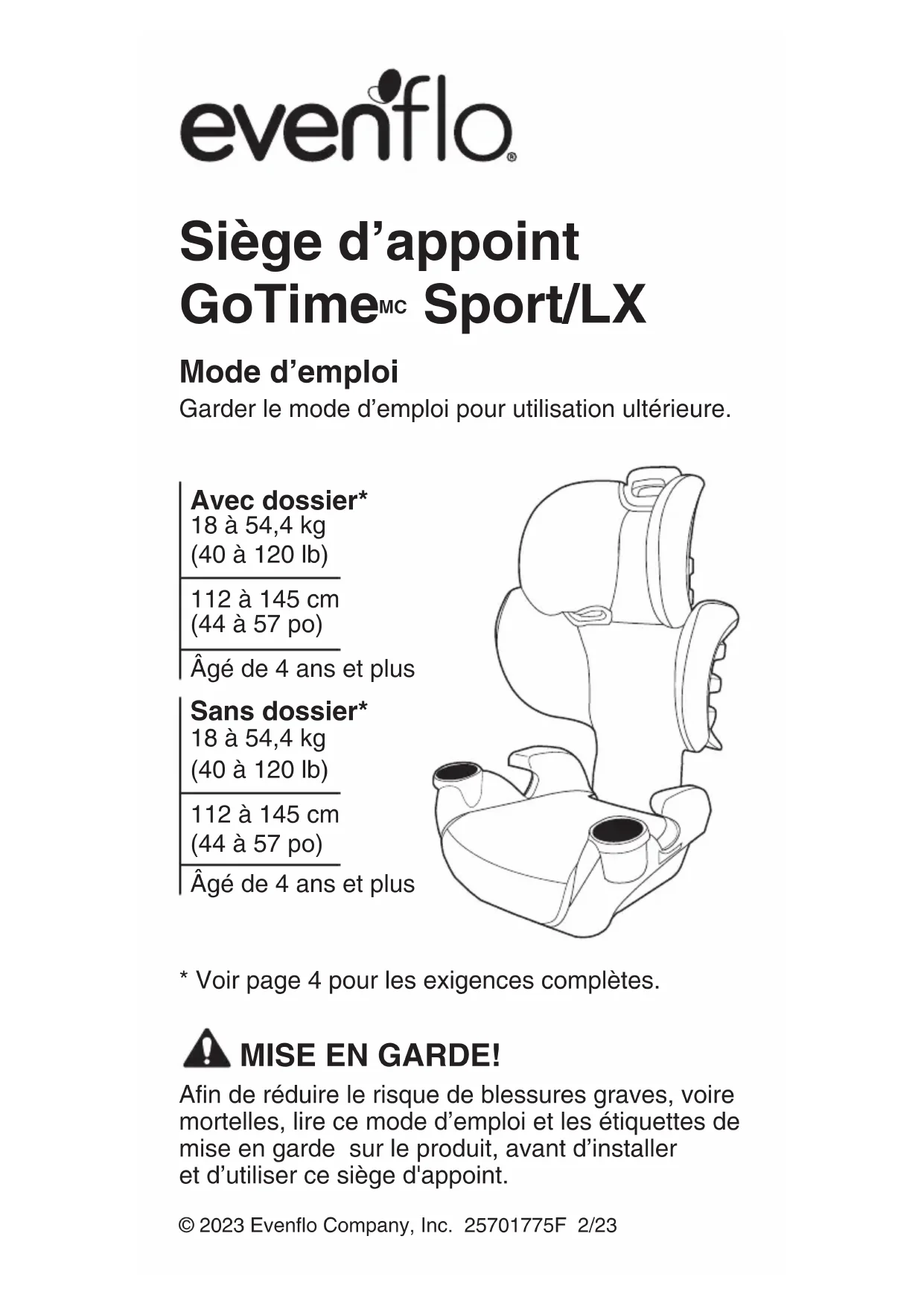 An de réduire le risque de blessures graves, voire mortelles, lire ce mode d’emploi et les étiquettes de mise en garde sur le produit, avant d’installer et d’utiliser ce siège d'appoint. © 2023 Eveno Company, Inc. 25701775F 2/23 Siège d’appoint GoTime