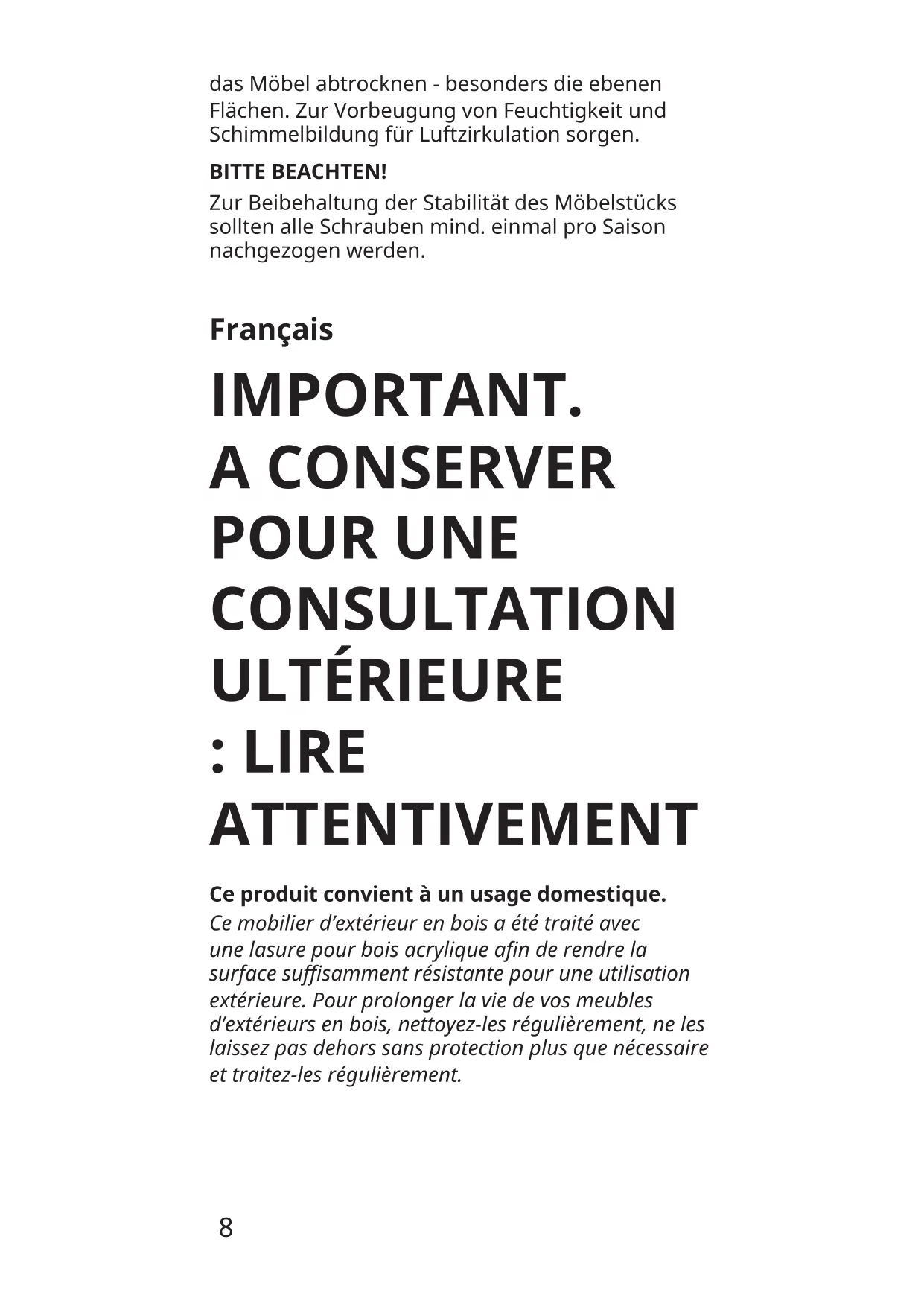 alle überüssige Lasur unbedingt direkt nach dem Auftragen mit einem trockenen Tuch wegwischen. Pinsel und Hände mit Wasser und Seife reinigen. Lagerung: Das Möbelstück sorgfältig säubern und trocknen, bevor es nach der Sommersaison eingelagert wird. Sommermöbel möglichst kühl und trocken drinnen lagern. Bei Lagerung im Freien möglichst unter einem Dach und mit einem Schutzüberzug versehen verstauen. Möbel, die ungeschützt vor Regen oder Schnee gelagert werden, sorgfältig mit einer Wasser abweisenden Hülle schützen und möglichst schrägstellen, damit Wasser besser abläuft. Nach Regen oder Schneefall8 das Möbel abtrocknen - besonders die ebenen Flächen. Zur Vorbeugung von Feuchtigkeit und Schimmelbildung für Luftzirkulation sorgen. BITTE BEACHTEN! Zur Beibehaltung der Stabilität des Möbelstücks sollten alle Schrauben mind. einmal pro Saison nachgezogen werden. Français IMPORTANT. ACONSERVER POUR UNE CONSULTATION ULTÉRIEURE : LIRE ATTENTIVEMENT Ce produit convient à un usage domestique. Ce mobilier d’extérieur en bois a été traité avec une lasure pour bois acrylique an de rendre la surface susamment résistante pour une utilisation extérieure. Pour prolonger la vie de vos meubles d’extérieurs en bois, nettoyez-les régulièrement, ne les laissez pas dehors sans protection plus que nécessaire et traitez-les régulièrement.9 NETTOYAGE Essuyer avec un chion doux humide et une solution savonneuse puis sécher avec un chion propre et sec. ENTRETIEN Vous pouvez facilement rafraîchir vos meubles d’extérieur en bois et les faire durer plus longtemps en les traitant régulièrement, une fois par an par exemple. Suivant le climat de votre lieu d’habitation et l’exposition des meubles au soleil et à la pluie, il faudra renouveler le traitement plus ou moins souvent. Le traitement empêche le bois de sécher et de se fendre en surface et empêche l’humidité d’y pénétrer. Pour les meubles extérieurs qui ne sont pas abrités, renouvelez le traitement si l’eau est absorbées immédiatement par le bois et ne forment pas des gouttes en surface. Appliquer une nouvelle couche de teinture : Choisissez un endroit à l’ombre pour nettoyer, appliquer une nouvelle couche de teinture et faire sécher les meubles. Évitez de les exposer directement au soleil.