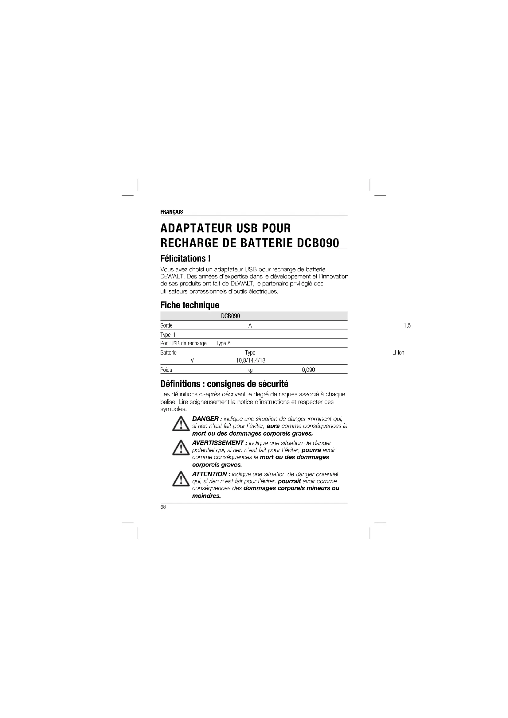 EWALT. Des années d’expertise dans le développement et l’innovation de ses produits ont fait de DEWALT, le partenaire privilégié des utilisateurs professionnels d’outils électriques. Fiche technique DCB090 Sortie A 1,5 Type 1 Port USB de recharge Type A Batterie Type Li-Ion V 10,8/14,4/18 Poids kg 0,090 Défi nitions: consignes de sécurité Les définitions ci-après décrivent le degré de risques associé à chaque balise. Lire soigneusement la notice d’instructions et respecter ces symboles.