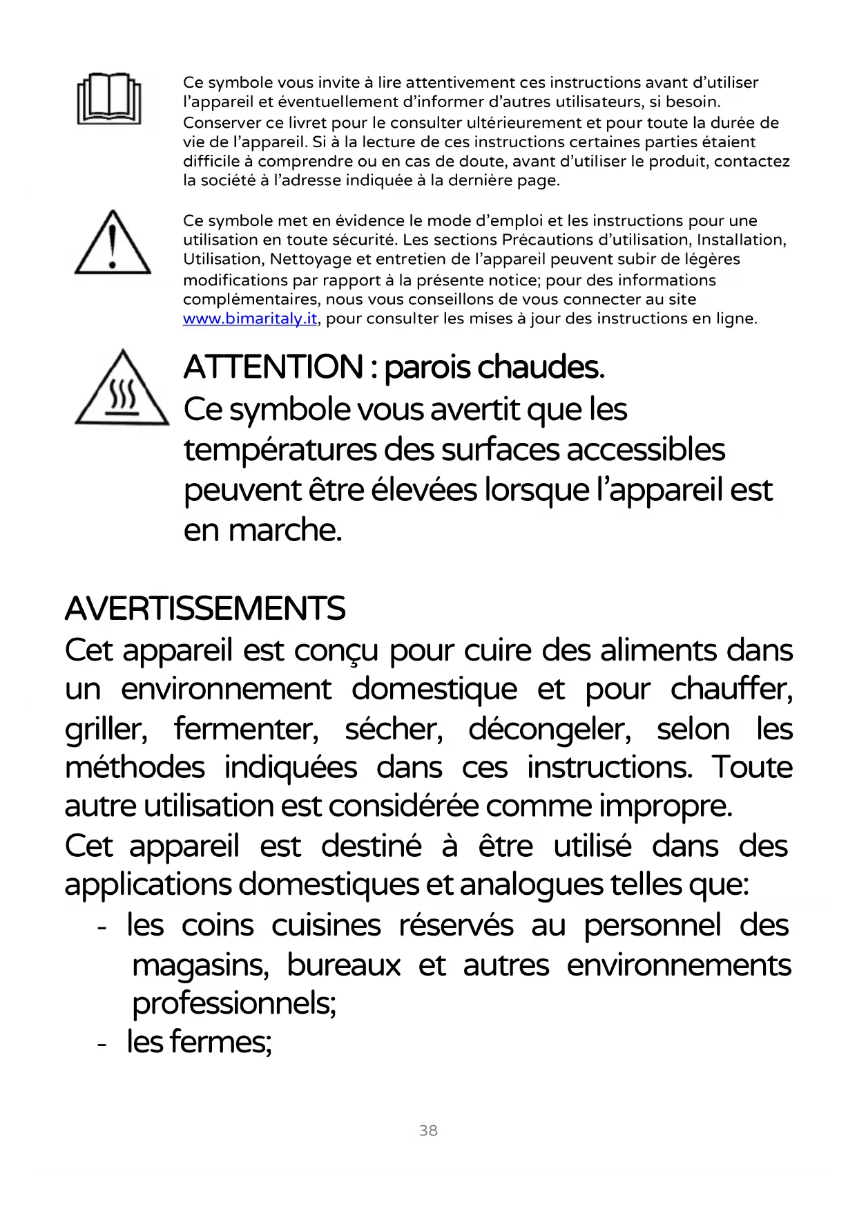 Ce symbole met en évidence le mode d’emploi et les instructions pour une utilisation en toute sécurité. Les sections Précautions d’utilisation, Installation, Utilisation, Nettoyage et entretien de l’appareil peuvent subir de légères modifications par rapport à la présente notice; pour des informations complémentaires, nous vous conseillons de vous connecter au site www.bimaritaly.it, pour consulter les mises à jour des instructions en ligne.