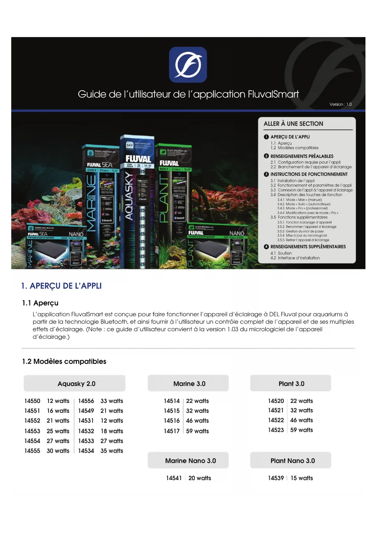 Aquasky 2.0 14550 12 watts 14551 16 watts 14552 21 watts 14553 25 watts 14554 27 watts 14555 30 watts 14556 33 watts 14549 21 watts 14531 12 watts 14532 18 watts 14533 27 watts 14534 35 watts Marine 3.0 Marine Nano 3.0 Plant 3.0 Plant Nano 3.0 14514 22 watts 14515 32 watts 14516 46 watts 14517 59 watts 14520 22 watts 14521 32 watts 14522 46 watts 14523 59 watts 14541 20 watts 14539 15 watts APERÇU DE L»APPLI1.1 Aperçu1.2 Modèles compatiblesRENSEIGNEMENTS PRÉALABLES 2.1 Configuration requise pour l’appli2.2 Branchement de l’appareil d’éclairageINSTRUCTIONS DE FONCTIONNEMENT3.1 Installation de l’appli3.2 Fonctionnement et paramètres de l’appli3.3 Connexion de l’appli à l’appareil d’éclairage3.4 Description des touches de fonction 3.4.1 Mode « Man » (manuel) 3.4.2 Mode « Auto » (automatique) 3.4.3 Mode « Pro » (professionnel) 3.4.4 Modifications avec le mode « Pro »3.5 Fonctions supplémentaires 3.5.1 Fonction balayage d’appareil 3.5.2 Renommer l’appareil d’éclairage 3.5.3 Gestion du mot de passe 3.5.4 Mise à jour du micrologiciel 3.5.5 Retirer l’appareil d’éclairageRENSEIGNEMENTS SUPPLÉMENTAIRES4.1 Soutien4.2 Interface d’installation ALLER æ UNE SECTION