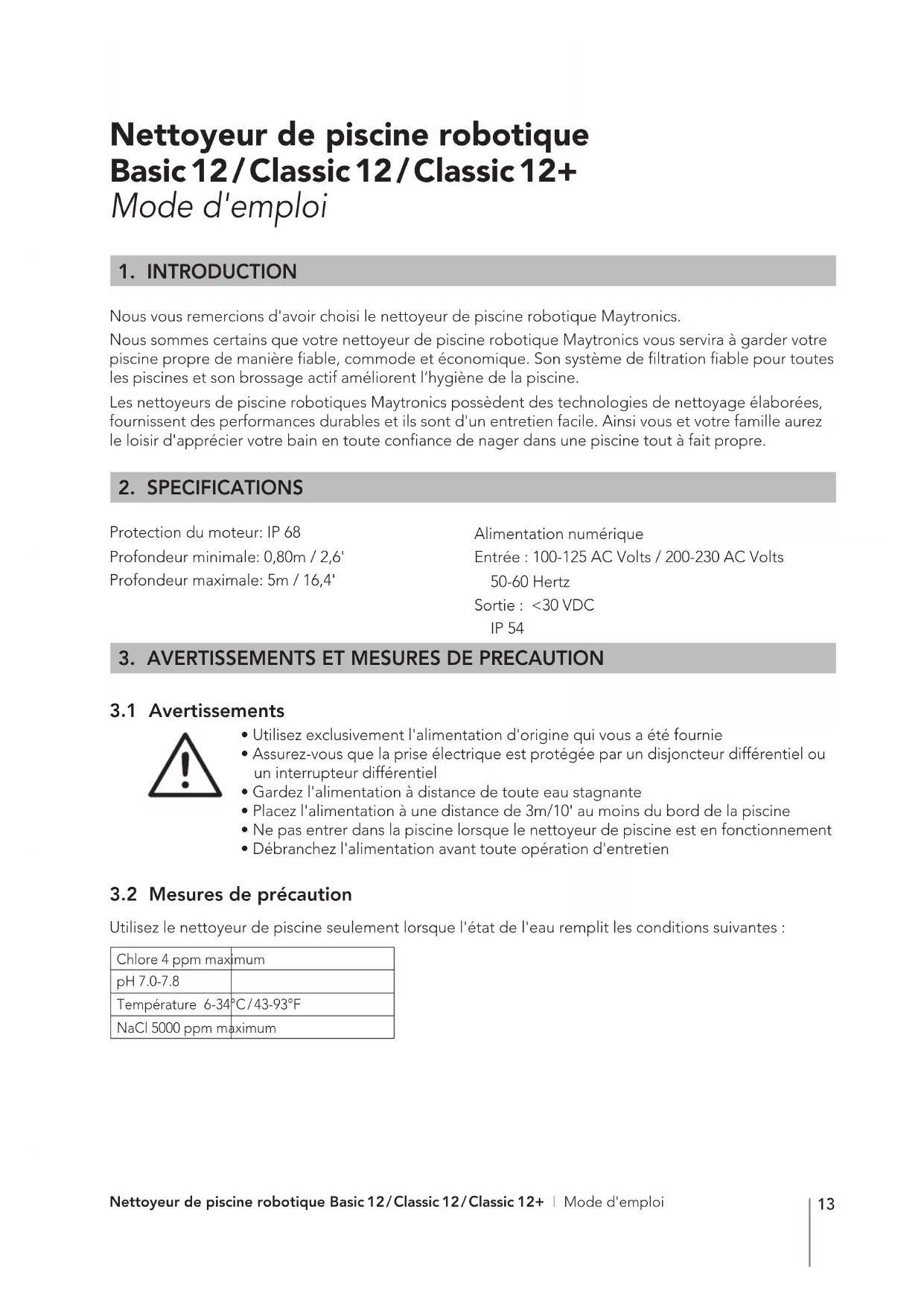 Utilisez le nettoyeur de piscine seulement lorsque l'état de l'eau remplit les conditions suivantes :Chlore 4 ppm maximumpH 7.0-7.8Température 6-34°C / 43-93°FNaCl 5000 ppm maximum CAUTION Alimentation numériqueEntrée : 100-125 AC Volts / 200-230 AC Volts 50-60 HertzSortie : <30 VDC IP 5414 Nettoyeur de piscine robotique Basic 12 / Classic 12 / Classic 12+ | Mode d'emploi