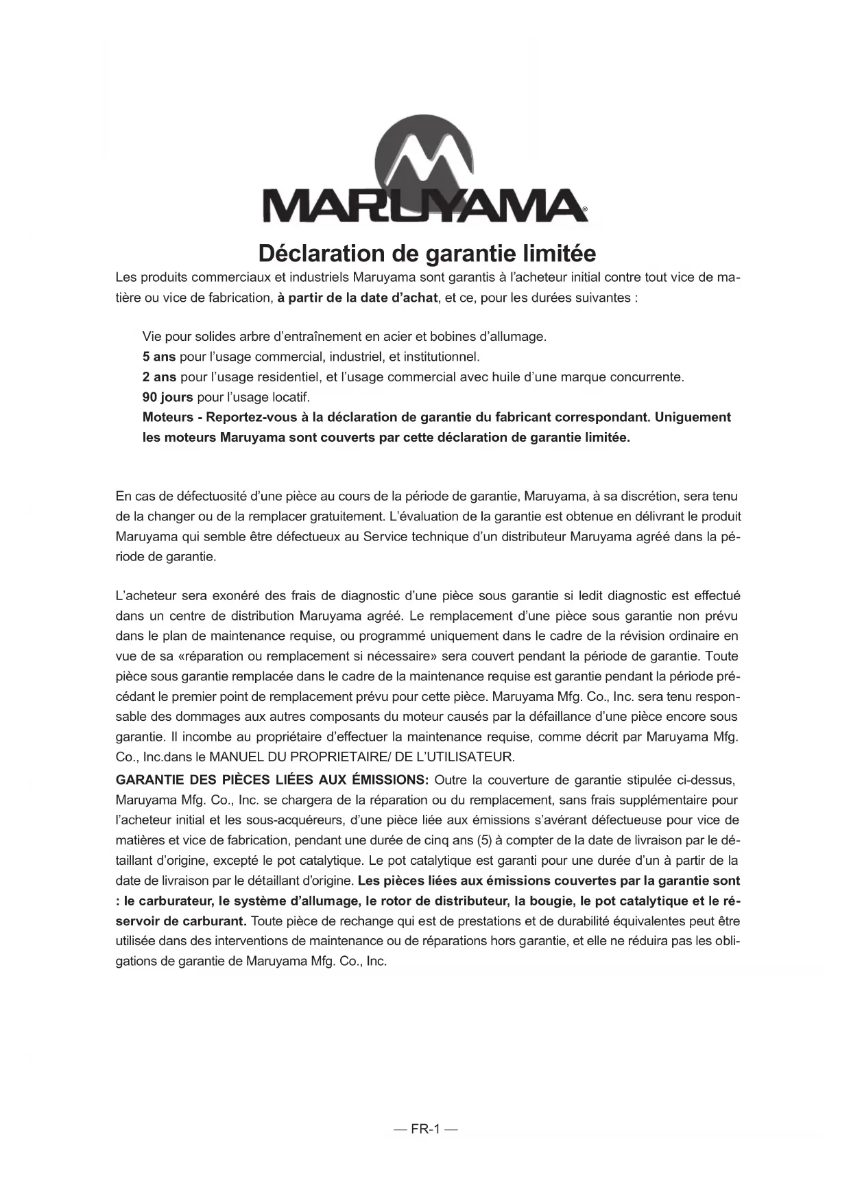Les petits moteurs hors route modèles 1997 et ultérieurs sont garantis pendant cinq ans. Si une pièce de votre moteur liée aux émissions s'avère défectueuse, la pièce sera réparée ou remplacée gratuitement par Maruyama Manufacturing Company, Inc.