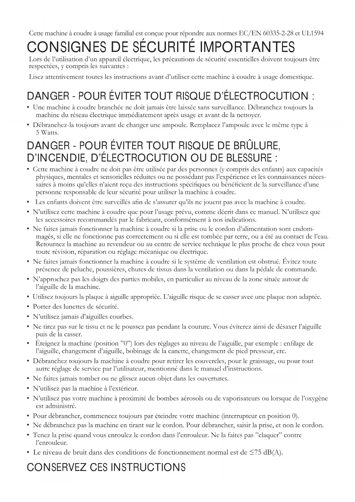 Mode d’emploiCette machine à coudre à usage familial est conçue pour répondre aux normes EC/EN 60335-2-28 et UL1594
