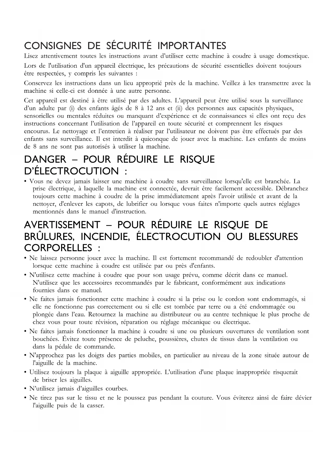 - Vous ne devez jamais laisser une machine à coudre sans surveillance lorsqu'elle est branchée. La prise électrique, à laquelle la machine est connectée, devrait être facilement accessible. Débranchez toujours cette machine à coudre de la prise immédiatement après l'avoir utilisée et avant de la nettoyer, d'enlever les capots, de lubrifier ou lorsque vous faites n'importe quels autres réglages mentionnés dans le manuel d'instruction. AVERTISSEMENT – POUR RÉDUIRE LE RISQUE DE