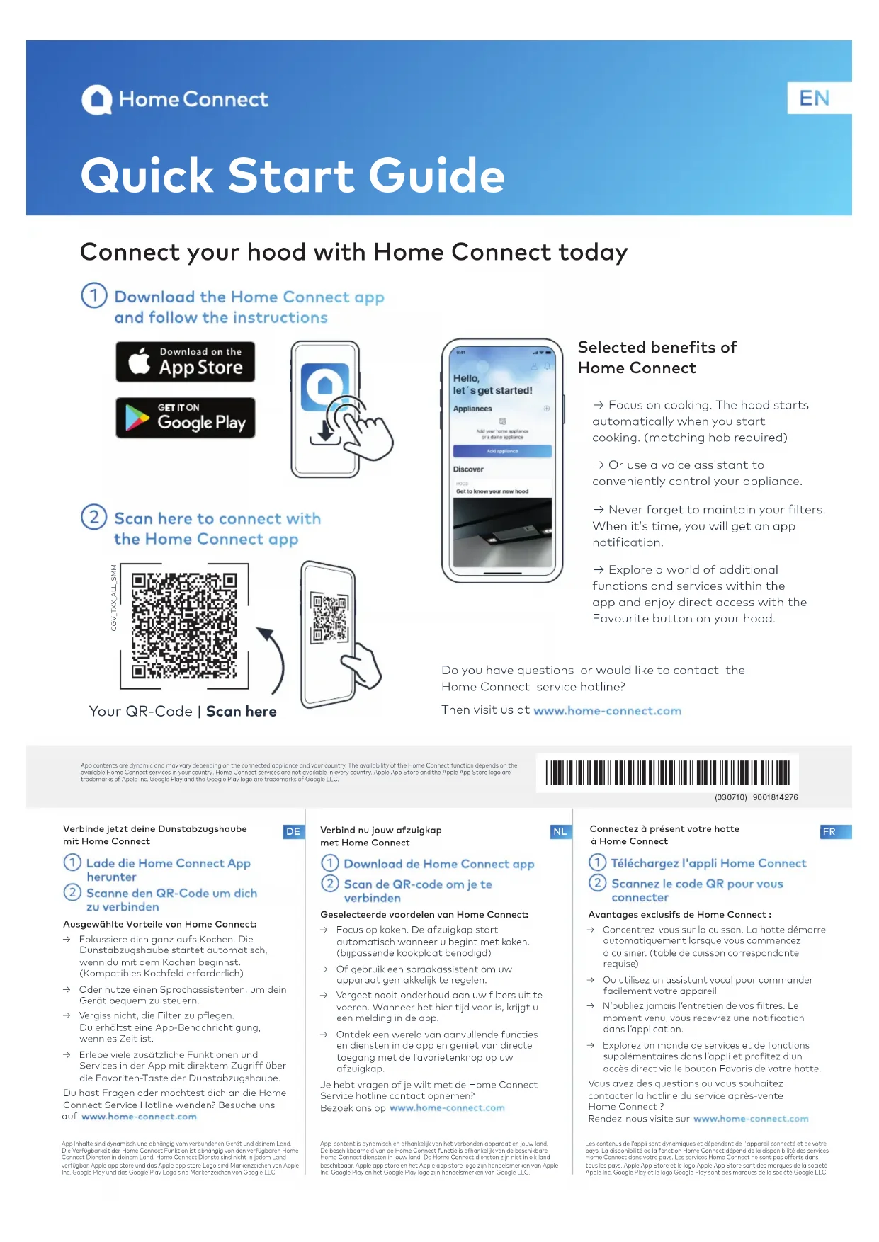 - N‘oubliez jamais l‘entretien de vos iltres. Le moment venu, vous recevrez une notiication dans l‘application. → Explorez un monde de services et de fonctions supplémentaires dans l‘appli et proitez d‘un accès direct via le bouton Favoris de votre hotte.Vous avez des questions ou vous souhaitez contacter la hotline du service après-vente HomeConnect? Rendez-nous visite sur www.home-connect.com App Inhalte sind dynamisch und abhängig vom verbundenen Gerät und deinem Land. Die Verügbarkeit der Home Connect Funktion ist abhängig von den verügbaren Home Connect Diensten in deinem Land. Home Connect Dienste sind nicht in jedem Land verügbar. Apple app store und das Apple app store Logo sind Markenzeichen von Apple Inc. Google Play und das Google Play Logo sind Markenzeichen von Google LLC. Les contenus de l'appli sont dynamiques et dépendent de l'appareil connecté et de votre pays. La disponibilité de la fonction Home Connect dépend de la disponibilité des services Home Connect dans votre pays. Les services HomeConnect ne sont pas offerts dans tous les pays. Apple App Store et le logo Apple App Store sont des marques de la société Apple Inc. Google Play et le logo Google Play sont des marques de la société Google LLC.DE NL FR