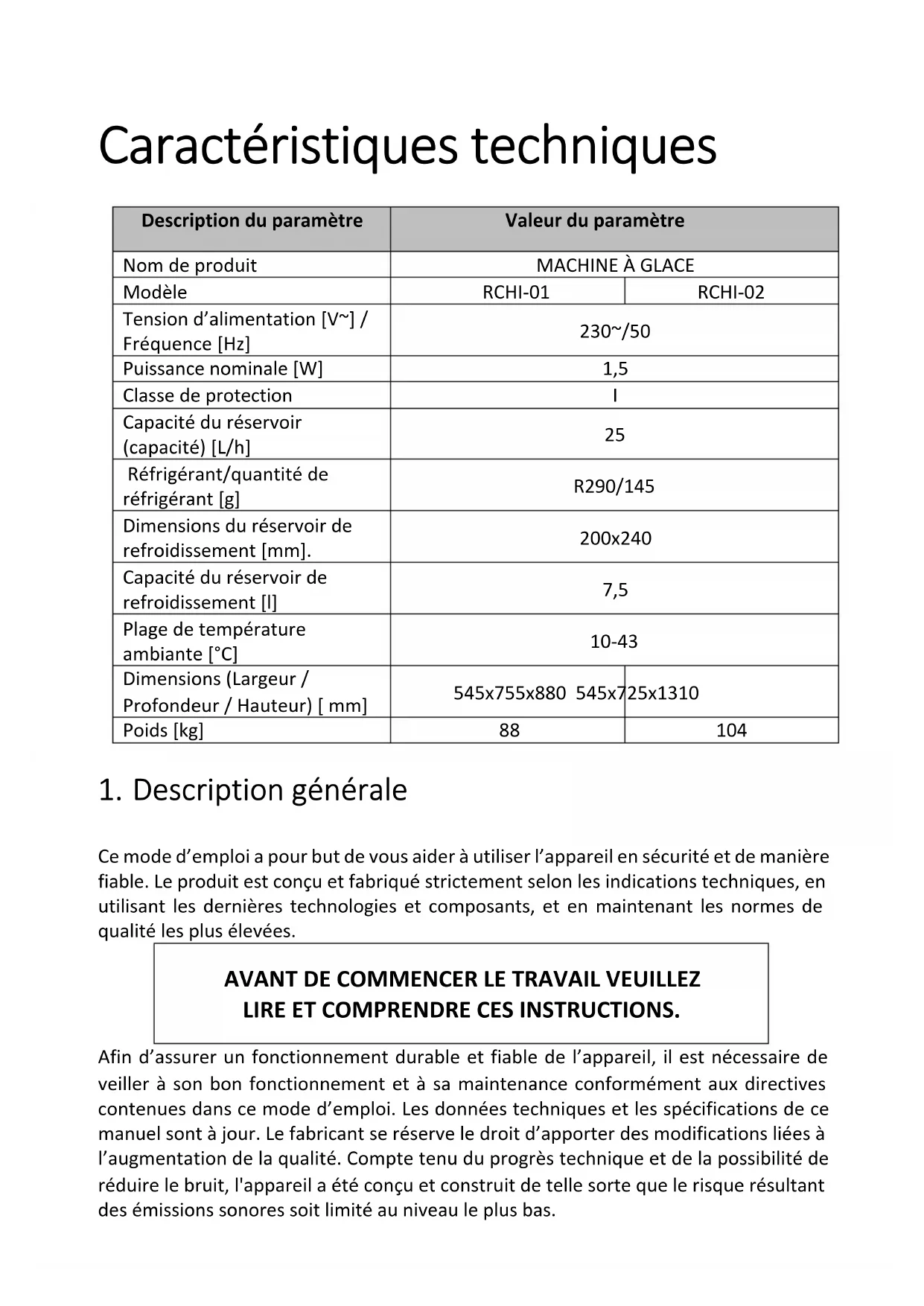 Le terme « appareil » ou « produit » utilisé dans les avertissements et dans le mode d’emploi désigne la Machine à glace.2.1. Sécurité électrique a) La fiche de l’appareil doit être compatible avec la prise de courant. Ne pas modifier la fiche de quelque manière que ce soit. Les fiches d’origine et les prises correspondantes réduisent le risque d’électrocution. b) Éviter de toucher les éléments mis à la terre tels que les tuyaux, les radiateurs, les cuisinières et les réfrigérateurs. Il existe un risque accru de choc électrique si le corps est mis à la terre en touchant l’appareil qui est exposé à l’action directe de la pluie, d’un sol humide ou qui est mis en marche dans un environnement humide. La pénétration d’eau dans l’appareil augmente le risque de son endommagement et d’électrocution. c) Ne pas utiliser le câble de manière non conforme à sa destination. Ne jamais l’utiliser pour déplacer l’appareil ou pour retirer la fiche de la prise. Garder le câble à l’écart des sources de chaleur, de l’huile, des arêtes tranchantes et des pièces mobiles. Les fils endommagés ou emmêlés augmentent le risque d’électrocution. d) S’il est impossible d’éviter l’utilisation de l’appareil dans un environnement humide, il est nécessaire d’utiliser un dispositif de courant résiduel (RCD). L’emploi d’un RCD réduit le risque d’électrocution. e) Il est interdit d’utiliser l’appareil si le câble d’alimentation est endommagé ou présente des signes évidents d’usure. Un câble d’alimentation endommagé doit être remplacé par un électricien qualifié ou par le service après-vente du fabricant. f) Pour éviter l’électrocution, ne pas immerger le câble, la fiche ou l’appareil lui- même dans l’eau ou tout autre liquide. Ne pas utiliser l’appareil sur des surfaces mouillées. 2.2. Sécurité au travail a) Veiller à ce que le lieu de travail soit bien rangé et bien éclairé. Tout désordre ou mauvais éclairage risquent d’entraîner des accidents. Soyez prévoyant et raisonnable, faites attention à ce que vous faites lors de l’utilisation de l’appareil. b) En cas de dommages ou d’anomalies dans le fonctionnement de l’appareil, il faut l’arrêter immédiatement et en informer une personne autorisée. c) En cas de doute quant au bon fonctionnement de l’appareil, contactez le service après-vente du fabricant. d) Le produit ne peut être réparé que par le service après-vente du fabricant. Ne pas effectuer les réparations par ses propres soins ! e) En cas d’incendie ou de départ de feu, utiliser uniquement les extincteurs à poudre ou à neige (CO2) pour éteindre l’appareil sous tension. f) Il est interdit aux enfants ou aux personnes non autorisées de rester sur le poste de travail.g) Vérifier régulièrement l'état des autocollants portant les informations sur la sécurité. Remplacer les autocollants s'ils sont illisibles. h) Conserver le mode d’emploi pour référence future. Si l’appareil est confié à des tiers, le mode d’emploi doit également être remis avec celui-ci.