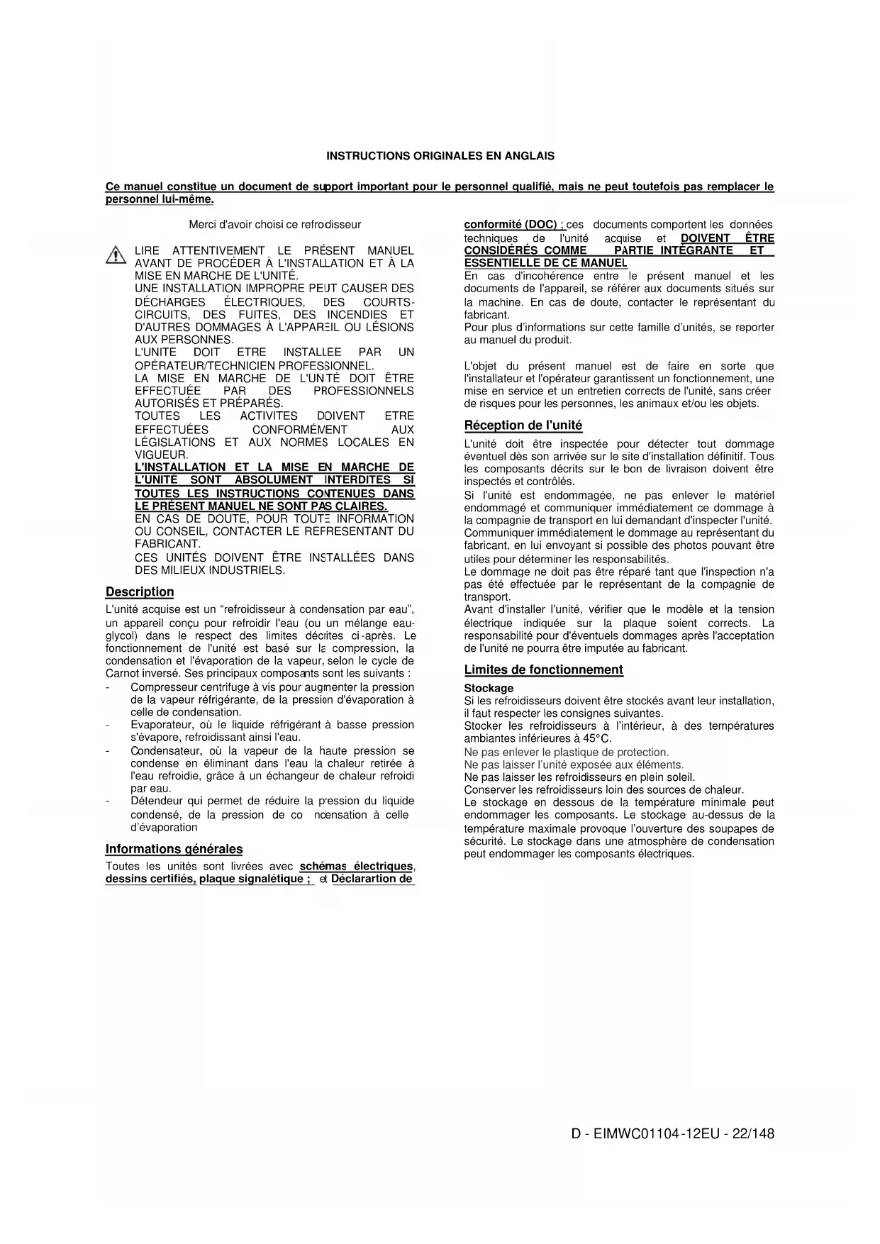 LE PRÉSENT MANUEL NE SONT PAS CLAI EN CAS DE DOUTE, POUR TOUTE INFORMATION OU CONSEIL, CONTACTER LE REPRÉSENTANT DU FABRICANT. CES UNITÉS DOIVENT ÊTRE INSTALLÉES DANS DES MILIEUX INDUSTRIELS. Description L'unité acquise est un “refroidisseur à condensation par eau”, un appareil conçu pour refroidir l'eau (ou un mélange eau glycol) dans le respect des limites décrites ci fonctionnement de l'unité est basé sur la compression, la condensation et l'évaporation de la vapeur, selon le cycle de Carnot inversé. Ses principaux composa nts sont les suivants