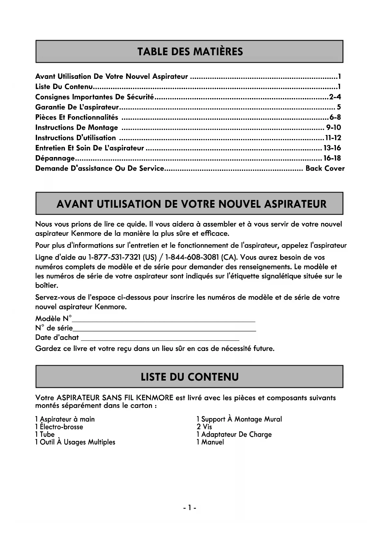 Votre ASPIRATEUR SANS FIL KENMORE est livré avec les pièces et composants suivants montés séparément dans le carton : 1 Aspirateur à main 1 Électro-brosse 1 Tube 1 Outil À Usages Multiples Nous vous prions de lire ce quide. Il vous aidera à assembler et à vous servir de votre nouvel aspirateur Kenmore de la manière la plus sûre et efficace. Pour plus d'informations sur l'entretien et le fonctionnement de l'aspirateur, appelez l'aspirateur Ligne d'aide au 1-877-531-7321 (US) / 1-844-608-3081 (CA). Vous aurez besoin de vos numéros complets de modèle et de série pour demander des renseignements. Le modèle et les numéros de série de votre aspirateur sont indiqués sur l'étiquette signalétique située sur le boîtier. Servez-vous de l’espace ci-dessous pour inscrire les numéros de modèle et de série de votre nouvel aspirateur Kenmore. Modèle N°____________________________________________ N° de série____________________________________________ Date d’achat ______________________________________ Gardez ce livre et votre reçu dans un lieu sûr en cas de nécessité future.