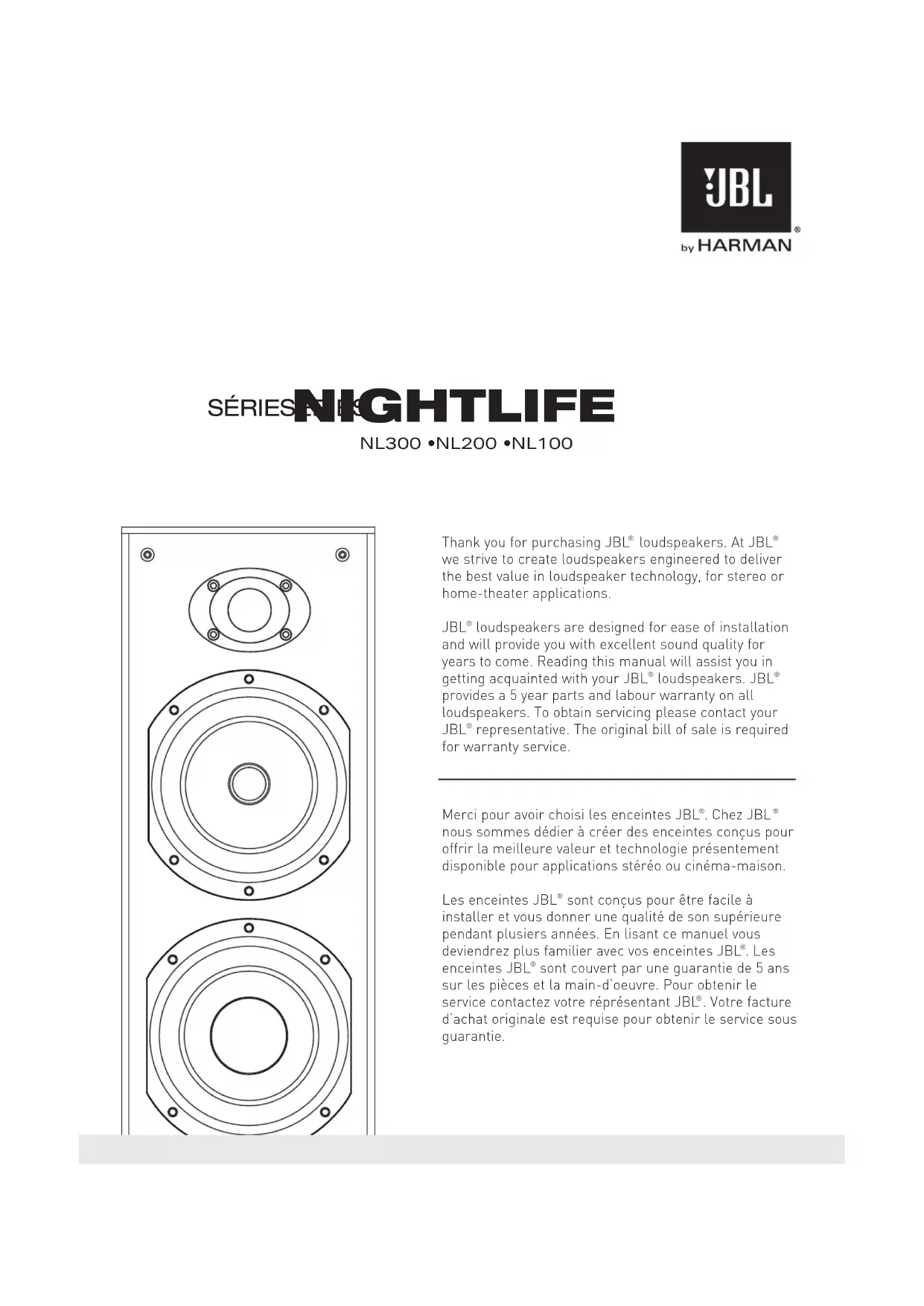 sont couvert par une guarantie de 5 ans sur les pièces et la main-d’oeuvre. Pour obtenir le service contactez votre réprésentant JBL