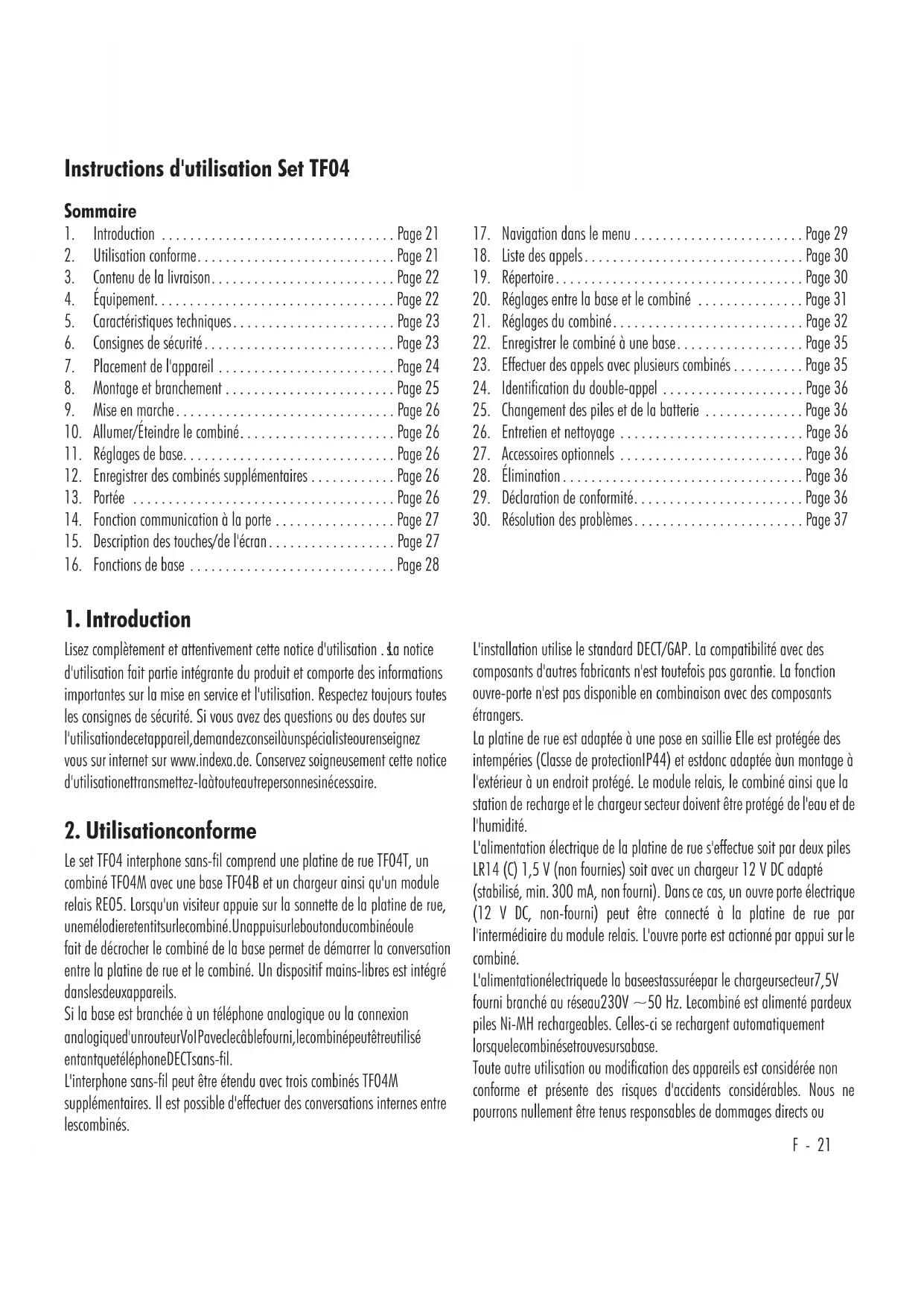 Lisez complètement et attentivement cette notice d'utilisation . La notice d'utilisation fait partie intégrante du produit et comporte des informations importantes sur la mise en service et l'utilisation. Respectez toujours toutes les consignes de sécurité. Si vous avez des questions ou des doutes sur l'utilisationdecetappareil,demandezconseilàunspécialisteourenseignez vous sur internet sur www.indexa.de. Conservez soigneusement cette notice d'utilisationettransmettez-laàtouteautrepersonnesinécessaire. Le set TF04 interphone sans-fil comprend une platine de rue TF04T, un combiné TF04M avec une base TF04B et un chargeur ainsi qu'un module relais RE05. Lorsqu'un visiteur appuie sur la sonnette de la platine de rue, unemélodieretentitsurlecombiné.Unappuisurleboutonducombinéoule fait de décrocher le combiné de la base permet de démarrer la conversation entre la platine de rue et le combiné. Un dispositif mains-libres est intégré danslesdeuxappareils. Si la base est branchée à un téléphone analogique ou la connexion analogiqued'unrouteurVoIPaveclecâblefourni,lecombinépeutêtreutilisé entantquetéléphoneDECTsans-fil. L'interphone sans-fil peut être étendu avec trois combinés TF04M supplémentaires. Il est possible d'effectuer des conversations internes entre lescombinés.