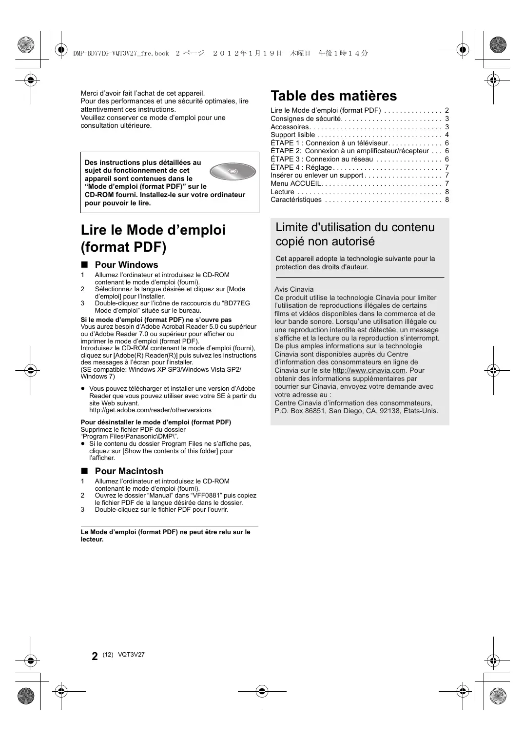 Mode d’emploi de base Lecteur de Blu-ray DiscTM Merci d’avoir fait l’achat de cet appareil. Pour des performances et une sécurité optimales, lire attentivement ces instructions. Veuillez conserver ce mode d’emploi pour une consultation ultérieure. Prise en main Des instructions plus détaillées au sujet du fonctionnement de cet appareil sont contenues dans le “Mode d’emploi (format PDF)” sur le CD-ROM fourni. Installez-le sur votre ordinateur pour pouvoir le lire. Lire le Mode d’emploi (format PDF) ∫ Pour Windows Allumez l’ordinateur et introduisez le CD-ROM contenant le mode d’emploi (fourni). Sélectionnez la langue désirée et cliquez sur [Mode d’emploi] pour l’installer. Double-cliquez sur l’icône de raccourcis du “BD77EG Mode d’emploi” située sur le bureau. Si le mode d’emploi (format PDF) ne s’ouvre pas Vous aurez besoin d’Adobe Acrobat Reader 5.0 ou supérieur ou d’Adobe Reader 7.0 ou supérieur pour afficher ou imprimer le mode d’emploi (format PDF). Introduisez le CD-ROM contenant le mode d’emploi (fourni), cliquez sur [Adobe(R) Reader(R)] puis suivez les instructions des messages à l’écran pour l’installer. (SE compatible: Windows XP SP3/Windows Vista SP2/ Windows 7)