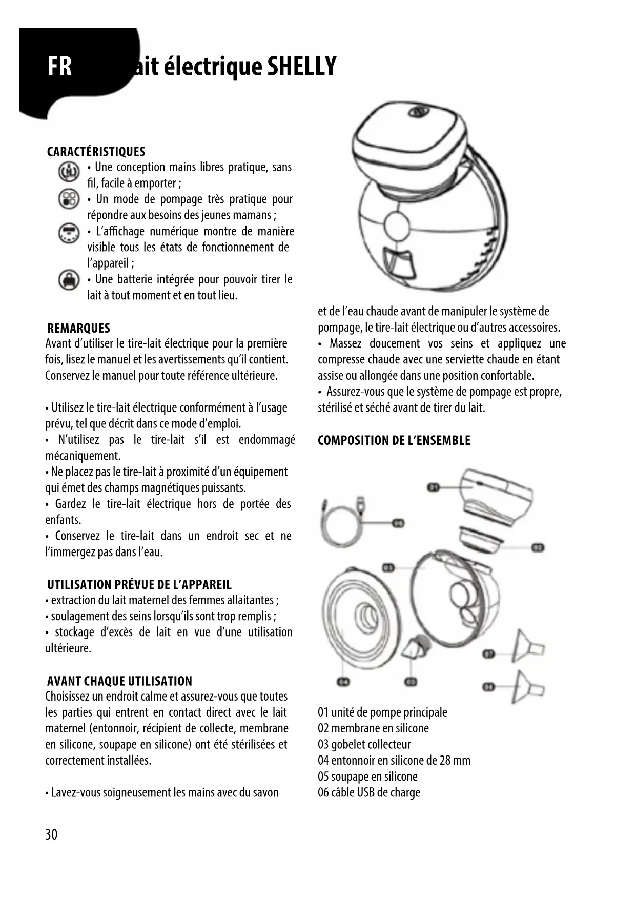 - Lavez-vous soigneusement les mains avec du savon FR Tire-lait électrique SHELLY et de l’eau chaude avant de manipuler le système de pompage, le tire-lait électrique ou d’autres accessoires.