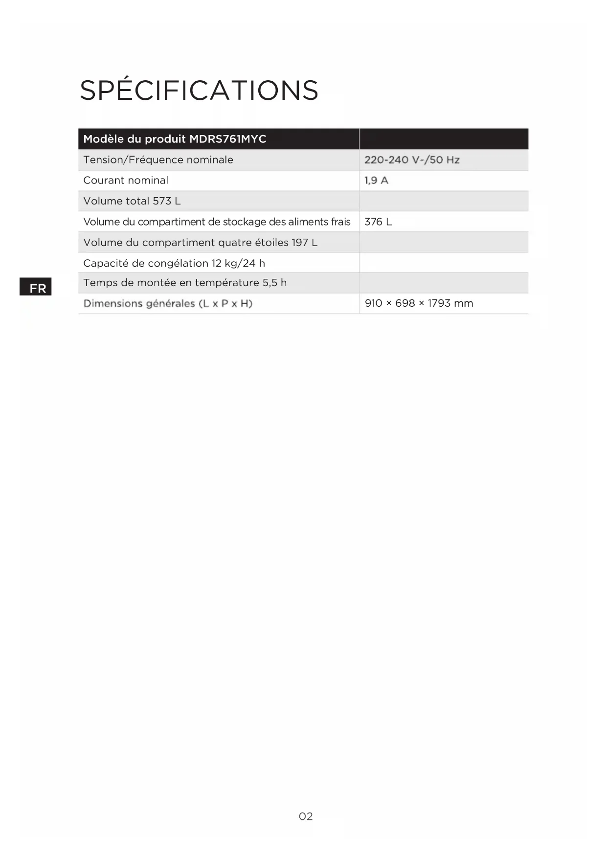 SPÉCIFICATIONS Modèle du produit MDRS761MYC Tension/Fréquence nominale Courant nominal Volume total 573 L Volume du compartiment de stockage des aliments frais 376 L Volume du compartiment quatre étoiles 197 L Capacité de congélation 12 kg/24 h Temps de montée en température 5,5 h 910 × 698 × 1793 mm03
