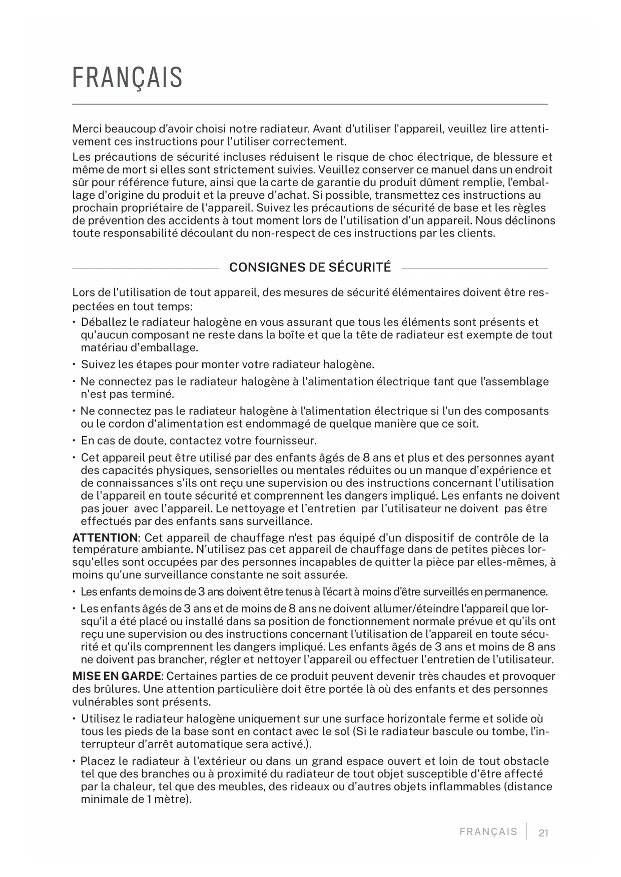 - Qualquer trabalho de manutenção ou reparo que envolva a substituição do tubo de halogênio deve ser realizado por um eletricista qualicado ou por um centro de serviço recomendado.21 FRANÇAIS FRANÇAIS Merci beaucoup d'avoir choisi notre radiateur. Avant d'utiliser l'appareil, veuillez lire attenti- vement ces instructions pour l'utiliser correctement. Les précautions de sécurité incluses réduisent le risque de choc électrique, de blessure et même de mort si elles sont strictement suivies. Veuillez conserver ce manuel dans un endroit sûr pour référence future, ainsi que la carte de garantie du produit dûment remplie, l'embal- lage d'origine du produit et la preuve d'achat. Si possible, transmettez ces instructions au prochain propriétaire de l'appareil. Suivez les précautions de sécurité de base et les règles de prévention des accidents à tout moment lors de l'utilisation d'un appareil. Nous déclinons toute responsabilité découlant du non-respect de ces instructions par les clients.