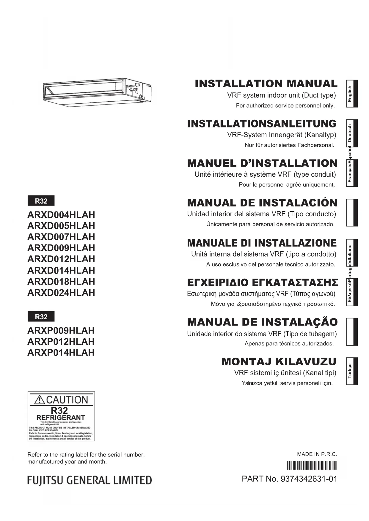 Unidade interior do sistema VRF (Tipo de tubagem) Apenas para técnicos autorizados.Refer to the rating label for the serial number, manufactured year and month.MADE IN P.R.C.Türkçe MONTAJ KILAVUZU VRF sistemi iç ünitesi (Kanal tipi) Yalnızca yetkili servis personeli için. R32 R32 R32 R32. 9374342631-01_IM_L8.indb 19374342631-01_IM_L8.indb 1 12-Feb-24 09:51:5812-Feb-24 09:51:58Fr-1 ATTENTION Avant d’utiliser ou d’installer le climatiseur, lisez attentivement toutes les informations relatives à la sécurité. N’essayez pas d’installer vous-même le climatiseur ou une partie de celui-ci. Cet appareil doit être installé par un personnel qualifié titulaire d’un certificat d’aptitude en manipulation des fluides frigorigènes. Référez-vous à la réglementation et à la législa- tion en vigueur sur l’emplacement d’installation. L’installation doit être effectuée conformément à la réglementation en vigueur sur l’em- placement d’installation et à la notice d’installation du fabricant. Cet appareil fait partie d’un ensemble formant un climatiseur. Il ne doit pas être installé isolément ou avec un équipement non autorisé par le fabricant. Utilisez toujours une ligne d’alimentation séparée, protégée par un disjoncteur fonction- nant sur tous les fils, en respectant une distance de 3 mm entre les contacts pour cet appareil. L’appareil doit être correctement relié à la masse et la ligne d’alimentation doit être équipée d’un disjoncteur différentiel afin de protéger les personnes. Les appareils ne sont pas antidéflagrants. Ils ne doivent donc pas être installés dans une atmosphère explosive. Ne touchez jamais des composants électriques immédiatement après la coupure de l’alimentation. Un choc électrique pourrait se produire. Après avoir coupé le courant, patientez 5 minutes avant de toucher des composants électriques. Cet appareil ne contient aucune pièce dont l’entretien est à charge de l’utilisateur. Pour les réparations, adressez-vous toujours à un technicien de service agréé. En cas de déménagement, faites appel à un technicien de service agréé pour débran- cher et installer l’appareil. Précautions pour l'utilisation du réfrigérant R32 Les procédures des travaux d’installation de base sont identiques aux modèles à réfrigé- rant conventionnel (R410A, R22). Toutefois, portez une attention particulière aux points suivants : AVERTISSEMENT
