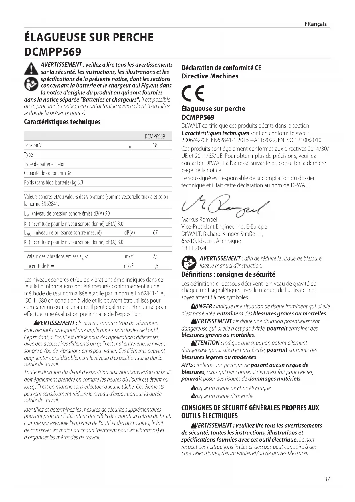 AVERTISSEMENT : indique une situation potentiellement dangereuse qui, si elle n’est pas évitée, pourrait entraîner des blessures graves oumortelles. ATTENTION : indique une situation potentiellement dangereuse qui, si elle n’est pas évitée, pourrait entraîner des blessures légères oumodérées.AVIS : indique une pratique ne posant aucun risque de blessures, mais qui par contre, si rien n’est fait pour l’éviter, pourrait poser des risques de dommagesmatériels. Indique un risque de chocélectrique. Indique un risqued’incendie. Déclaration de conformité CE Directive Machines Élagueuse sur perche DCMPP569DeWALT certifie que ces produits décrits dans la section Caractéristiques techniques sont en conformité avec: 2006/42/CE, EN62841-1:2015 +A11:2022, EN ISO 12100:2010.Ces produits sont également conformes aux directives 2014/30/UE et 2011/65/UE. Pour obtenir plus de précisions, veuillez contacter DeWALT à l’adresse suivante ou consulter la dernière page de la notice.Le soussigné est responsable de la compilation du dossier technique et il fait cette déclaration au nom de DeWALT.Markus Rompel Vice-President Engineering, E-Europe DeWALT, Richard-Klinger-Straße 11, 65510, Idstein, Allemagne 18.11.2024Les niveaux sonores et/ou de vibrations émis indiqués dans ce feuillet d'informations ont été mesurés conformément à une méthode de test normalisée établie par la norme EN62841-1 et ISO 11680 en condition à vide et ils peuvent être utilisés pour comparer un outil à un autre. Il peut également être utilisé pour effectuer une évaluation préliminaire de l’exposition. AVERTISSEMENT: le niveau sonore et/ou de vibrations émis déclaré correspond aux applications principales de l’outil. Cependant, si l’outil est utilisé pour des applications différentes, avec des accessoires différents ou qu’il est mal entretenu, le niveau sonore et/ou de vibrations émis peut varier. Ces éléments peuvent augmenter considérablement le niveau d’exposition sur la durée totale de travail.Toute estimation du degré d’exposition aux vibrations et/ou au bruit doit également prendre en compte les heures où l’outil est éteint ou lorsqu’il est en marche sans effectuer aucune tâche. Ces éléments peuvent sensiblement réduire le niveau d’exposition sur la durée totale de travail.Identifiez et déterminez les mesures de sécurité supplémentaires pouvant protéger l’utilisateur des effets des vibrations et/ou du bruit, comme par exemple l’entretien de l’outil et des accessoires, le fait de conserver les mains au chaud (pertinent pour les vibrations) et d’organiser les méthodes de travail.DCMPP569Tension V