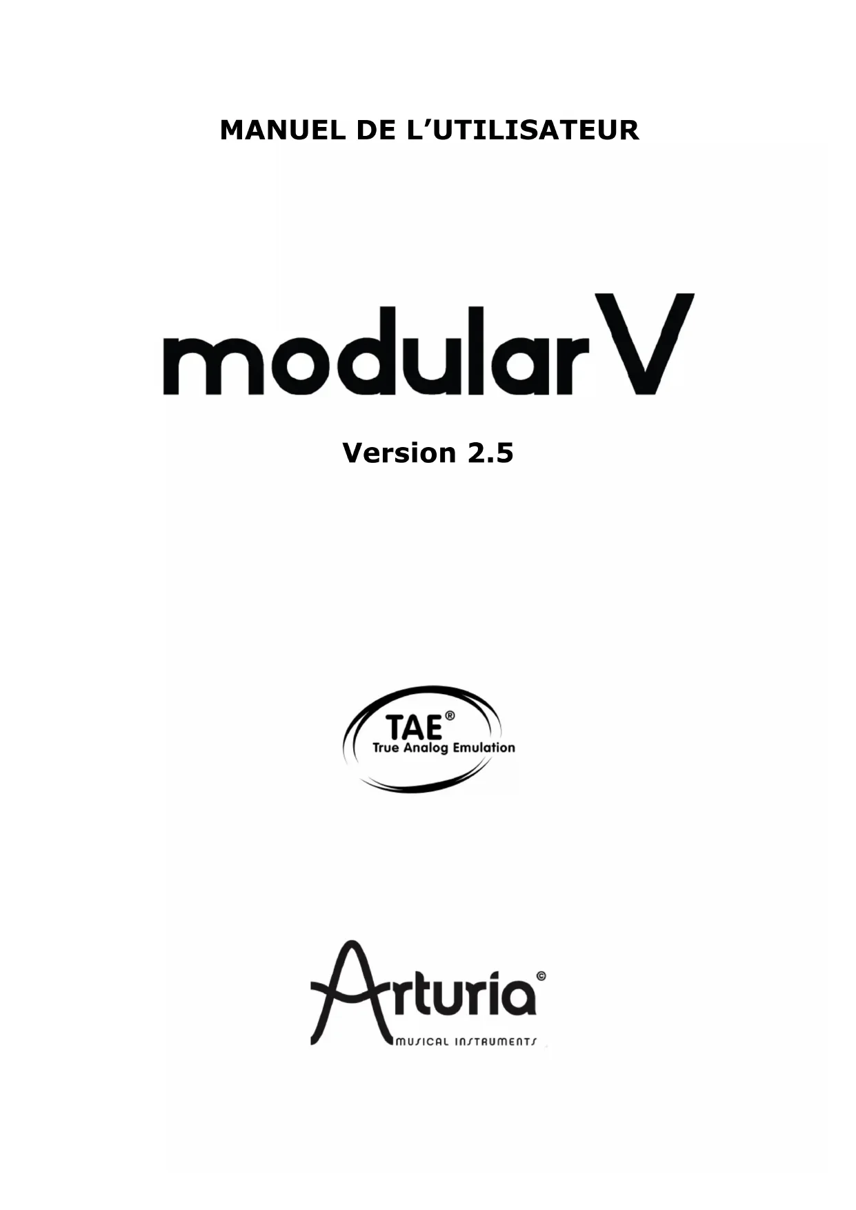 © ARTURIA SA – 1999-2012 – Tous droits réservés. 4, Chemin de Malacher 38240 Meylan FRANCE http://www.arturia.com Toutes les informations contenues dans ce manuel sont sujettes à modification sans préavis et n’engagent aucunement la responsabilité d’Arturia. Le logiciel décrit dans ce document fait l’objet d’une licence d’agrément et ne peut être copié sur un autre support. Aucune partie de cette publication ne peut en aucun cas être copiée, reproduite, ni même transmise ou enregistrée, sans la permission écrite préalable d’ARTURIA S.A. Tous les noms de produits ou de sociétés cités dans ce manuel sont des marques déposées de leurs propriétaires respectifs.ARTURIA – MODULAR V 2.6 – MANUEL DE L’UTILISATEUR
