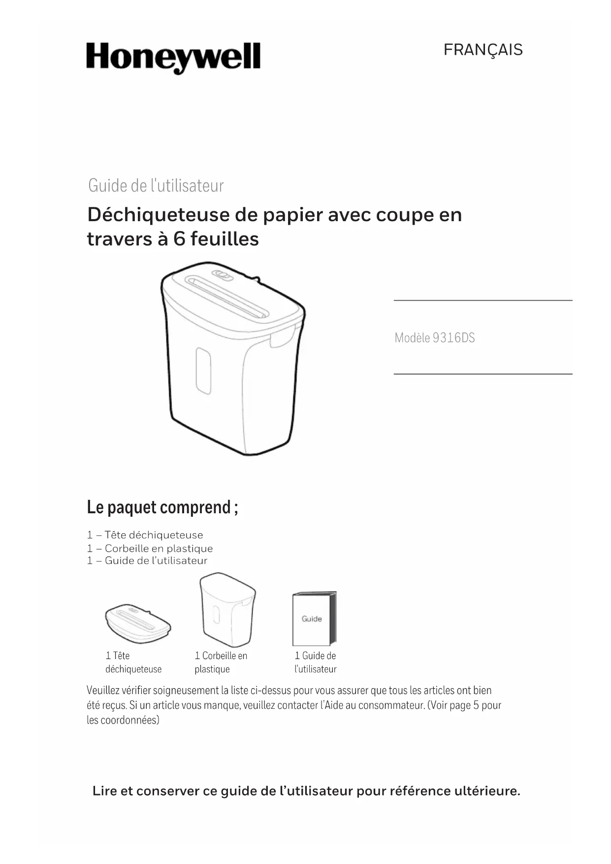 Lire et conserver ce guide de l’utilisateur pour référence ultérieure. FRANÇAIS Guide de l'utilisateur Déchiqueteuse de papier avec coupe en travers à 6 feuilles Le paquet comprend ; Veuillez vérifier soigneusement la liste ci-dessus pour vous assurer que tous les articles ont bien été reçus. Si un article vous manque, veuillez contacter l’Aide au consommateur. (Voir page 5 pour les coordonnées) Modèle 9316DS 1 – Tête déchiqueteuse1 – Corbeille en plastique1 – Guide de l’utilisateur1 Guide de l'utilisateur1 Tête déchiqueteuse1 Corbeille en plastiqueSOMMAIRE