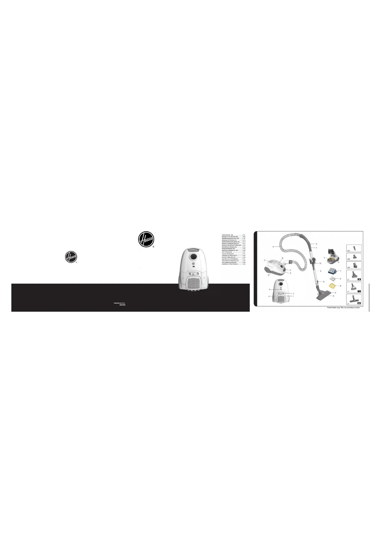 J. Variateur de puissance K. Variateur de puissance L. Poignée du exible M. Porte-accessoires N. Tube télescopique O. Bouton de réglage du tube télescopique P. Variateur de commande d’aspiration Q. Brosse pour moquette et sol dur R. Cadre de ltre pré-moteur S. Filtre pré-moteur T. Filtre d’évacuation U. Porte-sac