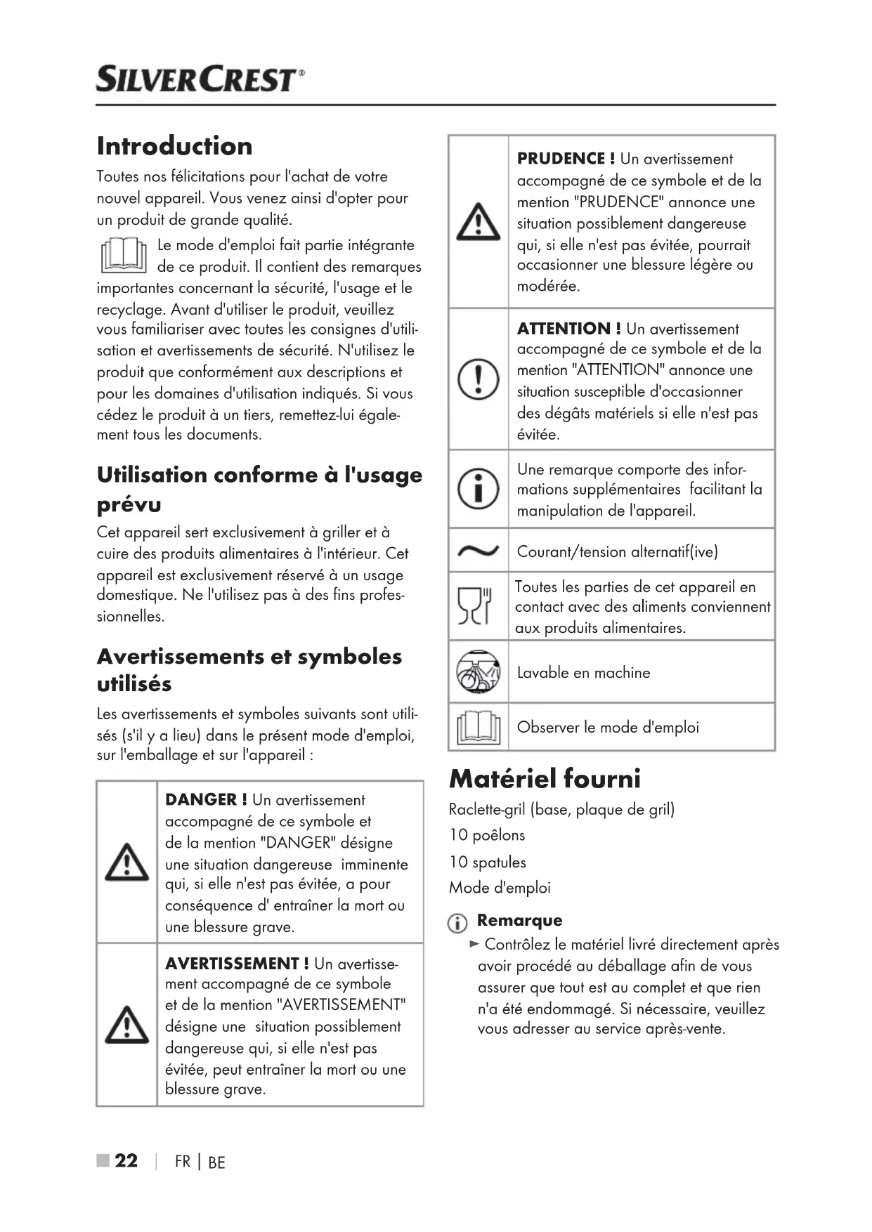 Introduction Toutes nos félicitations pour l'achat de votre nouvel appareil. Vous venez ainsi d'opter pour un produit de grande qualité. Le mode d'emploi fait partie intégrante de ce produit. Il contient des remarques importantes concernant la sécurité, l'usage et le recyclage. Avant d'utiliser le produit, veuillez vous familiariser avec toutes les consignes d'utili- sation et avertissements de sécurité. N'utilisez le produit que conformément aux descriptions et pour les domaines d'utilisation indiqués. Si vous cédez le produit à un tiers, remettez-lui égale- ment tous les documents. Utilisation conforme à l'usage prévu Cet appareil sert exclusivement à griller et à cuire des produits alimentaires à l'intérieur. Cet appareil est exclusivement réservé à un usage domestique. Ne l'utilisez pas à des fins profes- sionnelles. Avertissements et symboles utilisés Les avertissements et symboles suivants sont utili- sés (s'il y a lieu) dans le présent mode d'emploi, sur l'emballage et sur l'appareil: DANGER! Un avertissement accompagné de ce symbole et dela mention "DANGER" désigne une situation dangereuse imminente qui, si elle n'est pas évitée, a pour conséquence d' entraîner la mort ou une blessure grave. AVERTISSEMENT! Un avertisse- ment accompagné de ce symbole et de la mention "AVERTISSEMENT" désigne une situation possiblement dangereuse qui, si elle n'est pas évitée, peut entraîner la mort ou une blessure grave. PRUDENCE! Un avertissement accompagné de ce symbole et de la mention "PRUDENCE" annonce une situation possiblement dangereuse qui, si elle n'est pas évitée, pourrait occasionner une blessure légère ou modérée. ATTENTION! Un avertissement accompagné de ce symbole et de la mention "ATTENTION" annonce une situation susceptible d'occasionner des dégâts matériels si elle n'est pas évitée. Une remarque comporte des infor- mations supplémentaires facilitant la manipulation de l'appareil. Courant/tension alternatif(ive) Toutes les parties de cet appareil en contact avec des aliments conviennent aux produits alimentaires. Lavable en machine Observer le mode d'emploi Matériel fourni Raclette-gril (base, plaque de gril) 10 poêlons 10 spatules Mode d'emploi Remarque ► Contrôlez le matériel livré directement après avoir procédé au déballage afin de vous assurer que tout est au complet et que rien n'a été endommagé. Si nécessaire, veuillez vous adresser au service après-vente. IB_460256_SRGM1500B2_LB8.indb 22 11.06.2024 10:36:25FR