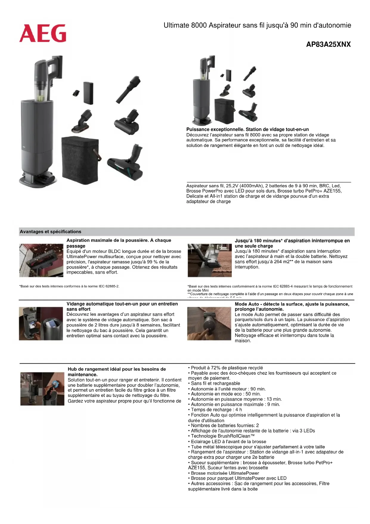 - Autres accessoires : Sac de rangement pour les accessoires, Filtre supplémentaire livré dans la boite Hub de rangement idéal pour les besoins de maintenance. Solution tout-en-un pour ranger et entretenir. Il contient une batterie supplémentaire pour doubler l’autonomie, et permet un entretien facile du filtre grâce à un filtre supplémentaire et au tuyau de nettoyage du filtre. Gardez votre aspirateur propre pour qu’il fonctionne de Jusqu’à 180 minutes* d’aspiration ininterrompue en une seule charge Jusqu’à 180 minutes* d’aspiration sans interruption avec l’aspirateur à main et la double batterie. Nettoyez sans effort jusqu’à 264 m2** de la maison sans interruption. *Basé sur des tests internes conformément à la norme IEC 62885-4 mesurant le temps de fonctionnement en mode Mini **Couverture de nettoyage complète à l’aide d’un passage en deux étapes pour couvrir chaque zone à une vitesse de déplacement de 0,5 m/s. Aspiration maximale de la poussière. À chaque passage Équipé d'un moteur BLDC longue durée et de la brosse UltimatePower multisurface, conçue pour nettoyer avec précision, l'aspirateur ramasse jusqu'à 99 % de la poussière*, à chaque passage. Obtenez des résultats impeccables, sans effort. *Basé sur des tests internes conformes à la norme IEC 62885-2. Mode Auto - détecte la surface, ajuste la puissance, prolonge l’autonomie. Le mode Auto permet de passer sans difficulté des parquets/sols durs à un tapis. La puissance d’aspiration s’ajuste automatiquement, optimisant la durée de vie de la batterie pour une plus grande autonomie. Nettoyage efficace et ininterrompu dans toute la maison. Vidange automatique tout-en-un pour un entretien sans effort Découvrez les avantages d’un aspirateur sans effort avec le système de vidage automatique. Son sac à poussière de 2 litres dure jusqu’à 8 semaines, facilitant le nettoyage du bac à poussière. Cela garantit un entretien optimal sans contact avec la poussière. Ultimate 8000 Aspirateur sans fil jusqu'à 90 min d'autonomie AP83A25XNXAspiration de la poussière sur sols durs IEC312