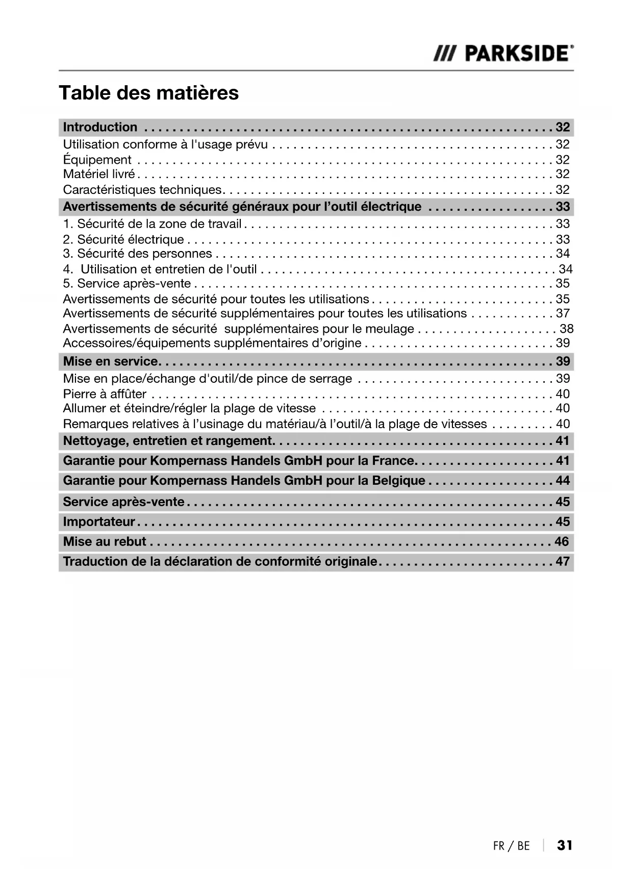 - Garantie pour Kompernass Handels GmbH pour la Belgique p. 44