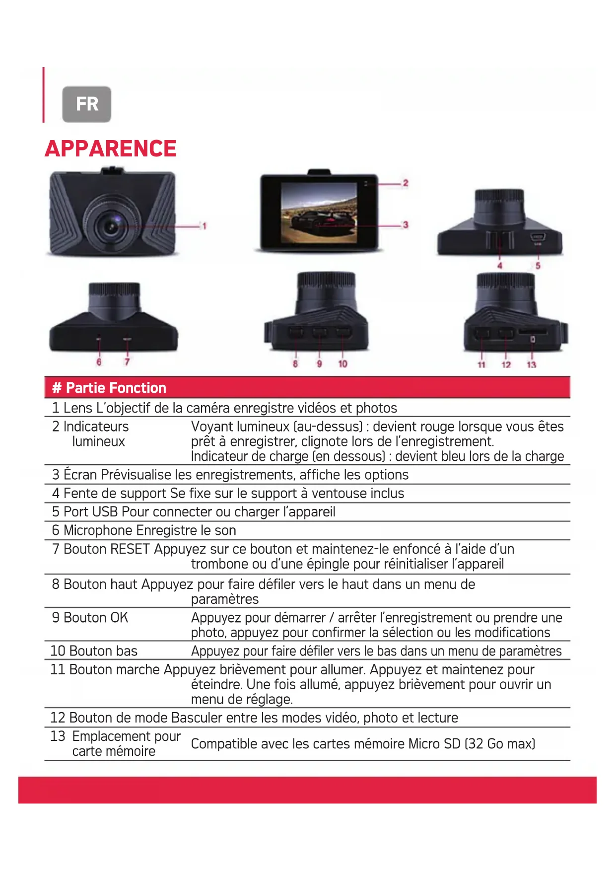 Video Format AVI Video resolution 1080P 1920 x 1080, 720P 1280 x 720 or VGA 640 x 480 Image Format JPG Photo resolution 12M/8M/5M/3M/2M/1M/ VGA G-SENSOR Yes Micro SD card up to 32GB Lens f=3.0mm, F2.0 Microphone YesFR APPARENCE # Partie Fonction 1 Lens L’objectif de la caméra enregistre vidéos et photos 2 Indicateurs lumineux Voyant lumineux (au-dessus) : devient rouge lorsque vous êtes prêt à enregistrer, clignote lors de l’enregistrement. Indicateur de charge (en dessous) : devient bleu lors de la charge 3 Écran Prévisualise les enregistrements, affiche les options 4 Fente de support Se fixe sur le support à ventouse inclus 5 Port USB Pour connecter ou charger l’appareil 6 Microphone Enregistre le son 7 Bouton RESET Appuyez sur ce bouton et maintenez-le enfoncé à l’aide d’un trombone ou d’une épingle pour réinitialiser l’appareil 8 Bouton haut Appuyez pour faire défiler vers le haut dans un menu de paramètres 9 Bouton OK Appuyez pour démarrer / arrêter l’enregistrement ou prendre une photo, appuyez pour confirmer la sélection ou les modifications 10 Bouton bas Appuyez pour faire défiler vers le bas dans un menu de paramètres 11 Bouton marche Appuyez brièvement pour allumer. Appuyez et maintenez pour éteindre. Une fois allumé, appuyez brièvement pour ouvrir un menu de réglage. 12 Bouton de mode Basculer entre les modes vidéo, photo et lecture